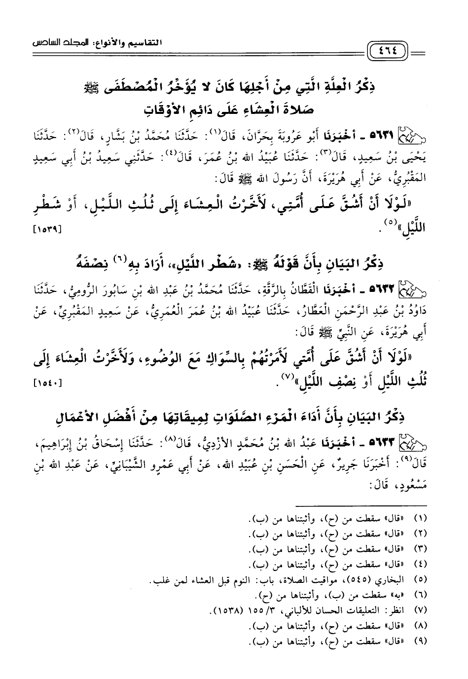 ٥٦٣١ - أَخبَرنا أَبُو عَرُوبَةَ بِحَرَّانَ، قَالَ: حَدثنا مُحَمَّدُ بْنُ بَشَّارٍ، قَالَ: حَدثنا يَحْيَى بْنُ سَعِيدٍ، قَالَ: حَدثنا عُبَيْدُ اللهِ بْنُ عُمَرَ، قَالَ: حَدَّثَنِي سَعِيدُ بْنُ أَبِي سَعِيدٍ الْمَقْبُرِيُّ، عَنْ أَبِي هُرَيْرَةَ، أَنَّ رَسُولَ اللهِ صَلى الله عَلَيه وسَلم قَالَ: "لَوْلَا أَنْ أَشُقَّ عَلَى أُمَّتِي، لأَخَّرْتُ الْعِشَاءَ إِلَى ثُلُثِ اللَّيْلِ، أَوْ شَطْرِ اللَّيْلِ". [١٥٣٩]