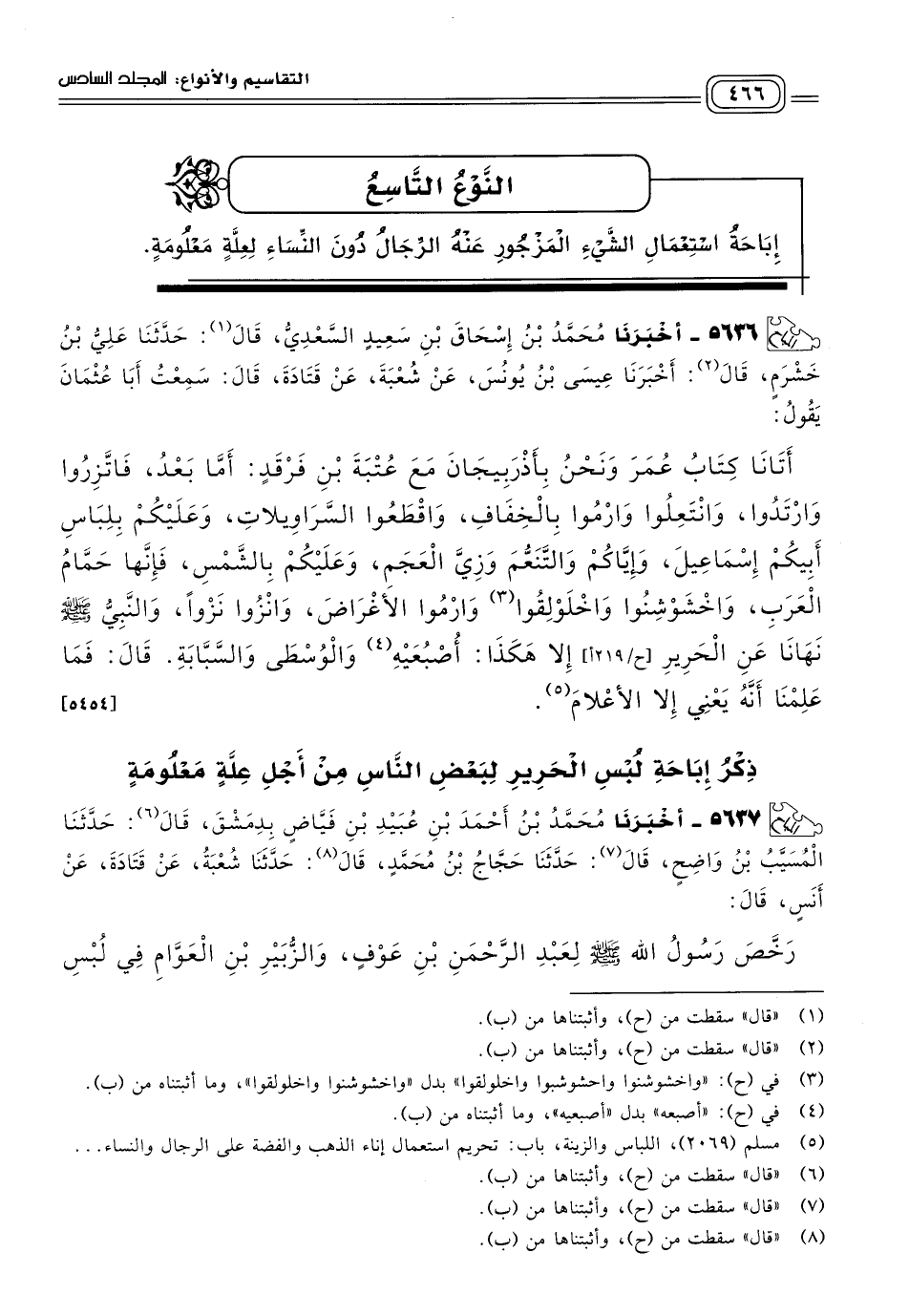 ٥٦٣٧ - أَخبَرنا مُحَمَّدُ بْنُ أَحْمَدَ بْنِ عُبَيْدِ بْنِ فَيَّاضٍ، بِدِمَشْقَ، قَالَ: حَدثنا الْمُسَيَّبُ بْنُ وَاضِحٍ، قَالَ: حَدثنا حَجَّاجُ بْنُ مُحَمَّدٍ، قَالَ: حَدثنا شُعْبَةُ، عَنْ قَتَادَةَ، عَنْ أَنَسٍ، قَالَ: رَخَّصَ رَسُولُ اللهِ صَلى الله عَلَيه وسَلم لِعَبْدِ الرَّحْمَنِ بْنِ عَوْفٍ، وَالزُّبَيْرِ بْنِ الْعَوَّامِ فِي لُبْسِ الْحَرِيرِ مِنْ حِكَّةٍ كَانَتْ بِهِمَا. [٥٤٣١]