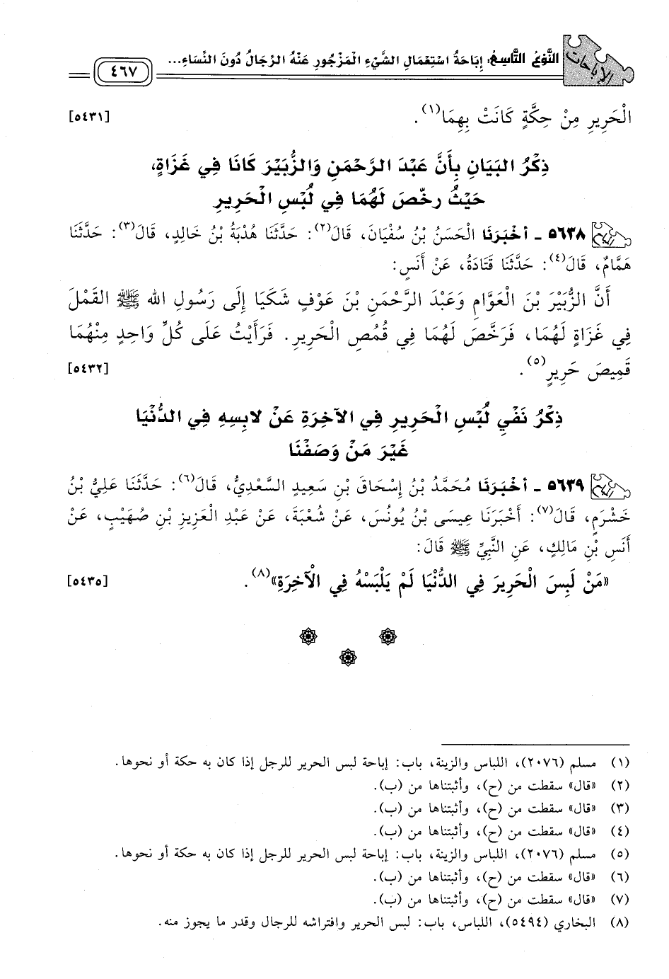 ٥٦٣٨ - أَخبَرنا الْحَسَنُ بْنُ سُفْيَانَ، قَالَ: حَدثنا هُدْبَةُ بْنُ خَالِدٍ، قَالَ: حَدثنا هَمَّامٌ، قَالَ: حَدثنا قَتَادَةُ، عَنْ أَنَسٍ، أَنَّ الزُّبَيْرَ بْنَ الْعَوَّامِ وَعَبْدَ الرَّحْمَنِ بْنَ عَوْفٍ شَكَيَا إِلَى رَسُولِ اللهِ صَلى الله عَلَيه وسَلم الْقَمْلَ فِي غَزَاةٍ لَهُمَا، فَرَخَّصَ لَهُمَا فِي قُمُصِ الْحَرِيرِ، فَرَأَيْتُ عَلَى كُلِّ وَاحِدٍ مِنْهُمَا قَمِيصَ حَرِيرٍ. [٥٤٣٢]