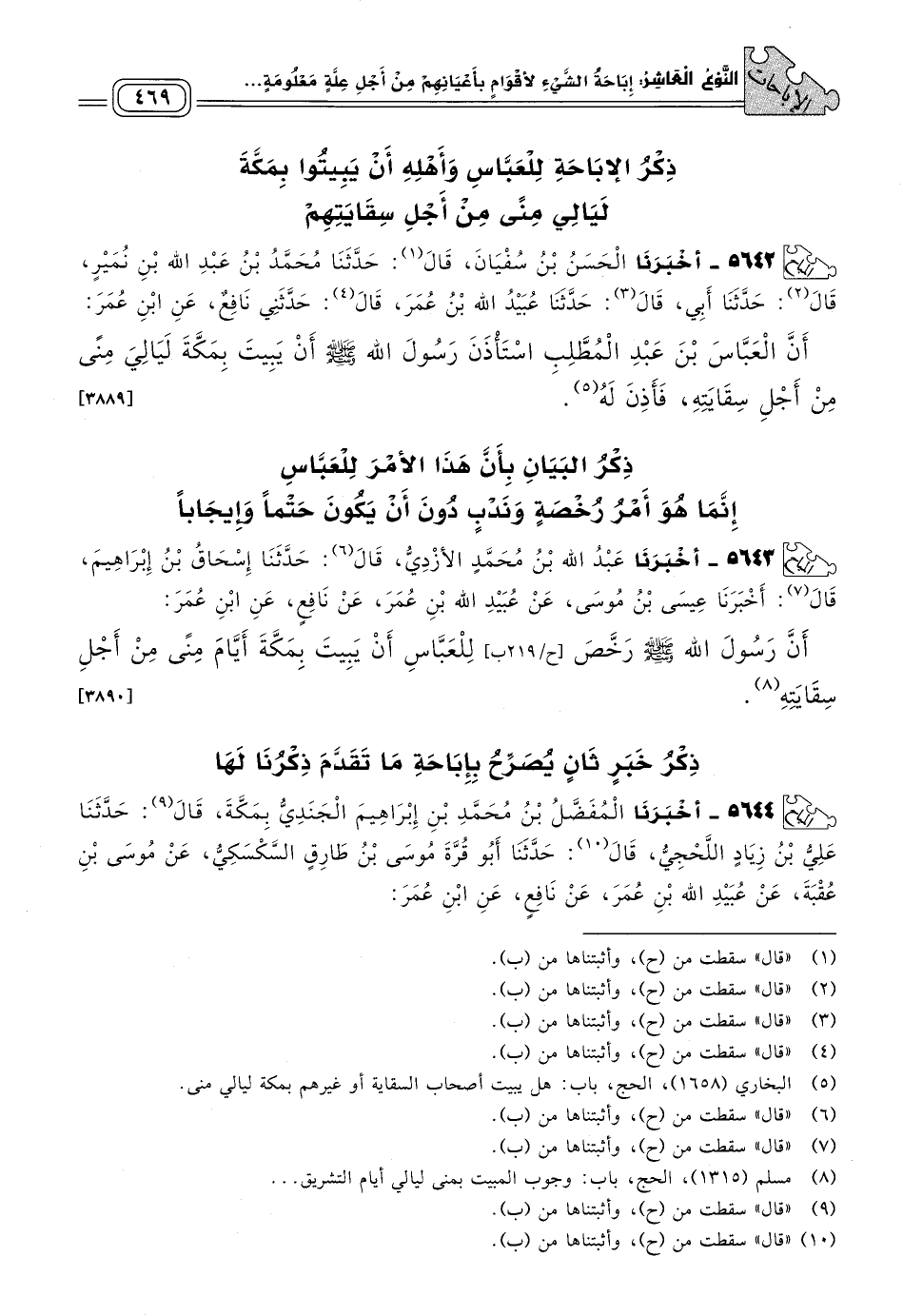 ٥٦٤٤ - أَخبَرنا الْمُفَضَّلُ بْنُ مُحَمَّدِ بْنِ إِبْرَاهِيمَ الْجَنَدِيُّ بِمَكَّةَ، قَالَ: حَدثنا عَلِيُّ بْنُ زِيَادٍ اللَّحْجِيُّ، قَالَ: حَدثنا أَبُو قُرَّةَ مُوسَى بْنُ طَارِقٍ السَّكْسَكِيُّ، عَنْ مُوسَى بْنِ عُقْبَةَ، عَنْ عُبَيْدِ اللهِ بْنِ عُمَرَ، عَنْ نَافِعٍ، عَنِ ابْنِ عُمَرَ، أَنَّ الْعَبَّاسَ بْنَ عَبْدِ الْمُطَّلِبِ اسْتَأْذَنَ النَّبِيَّ صَلى الله عَلَيه وسَلم أَنْ يَبِيتَ بِمَكَّةَ لَيَالِيَ مِنًى مِنْ أَجْلِ سِقَايَتِهِ، فَأَذِنَ لَهُ مِنْ أَجْلِ السِّقَايَةِ. [٣٨٩١]