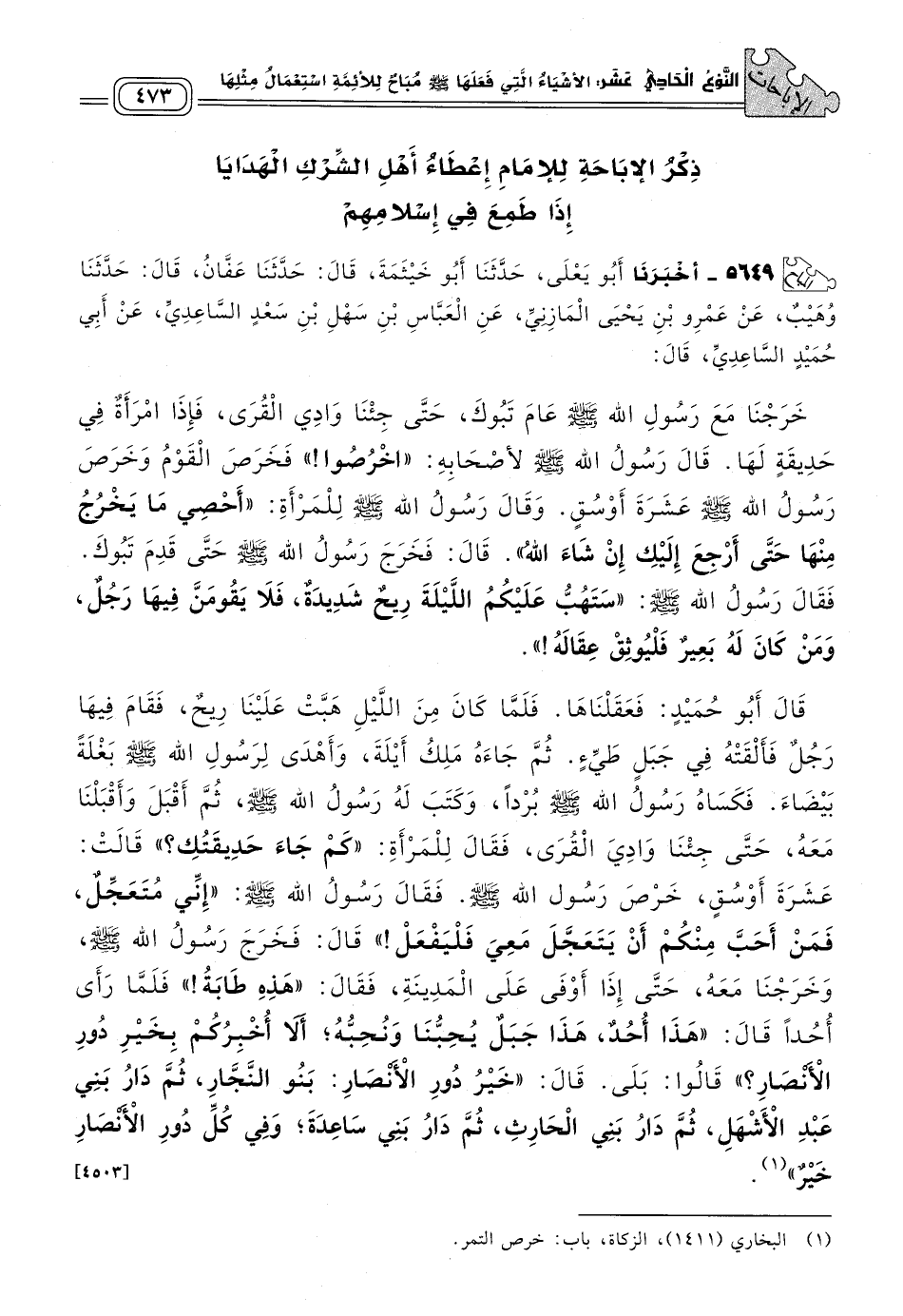 قَالَ أَبُو حُمَيْدٍ: فَعَقَلْنَاهَا، فَلَمَّا كَانَ مِنَ اللَّيْلِ هَبَّتْ عَلَيْنَا رِيحٌ، فَقَامَ فِيهَا رَجُلٌ فَأَلْقَتْهُ فِي جَبَلِ طَيِّءٍ، ثُمَّ جَاءَهُ مَلِكُ أَيْلَةَ، وَأَهْدَى لِرَسُولِ اللهِ صَلى الله عَلَيه وسَلم بَغْلَةً بَيْضَاءَ، فَكَسَاهُ رَسُولُ اللهِ صَلى الله عَلَيه وسَلم بُرْدًا، وَكَتَبَ لَهُ رَسُولُ اللهِ صَلى الله عَلَيه وسَلم، ثُمَّ أَقْبَلَ وَأَقْبَلْنَا مَعَهُ، حَتَّى جِئْنَا وَادِي الْقُرَى، فَقَالَ لِلْمَرْأَةِ: "كَمْ جَاءَ حَدِيقَتُكِ؟ " قَالَتْ عَشْرَةُ أَوْسُقٍ، خَرْصَ رَسُولِ اللهِ صَلى الله عَلَيه وسَلم، فَقَالَ رَسُولُ اللهِ صَلى الله عَلَيه وسَلم: "إِنِّي مُتَعَجِّلٌ، فَمَنْ أَحَبَّ مِنْكُمْ أَنْ يَتَعَجَّلَ مَعِي فَلْيَفْعَلْ! " قَالَ: فَخَرَجَ رَسُولُ اللهِ صَلى الله عَلَيه وسَلم، وَخَرَجْنَا مَعَهُ، حَتَّى إِذَا أَوْفَى عَلَى الْمَدِينَةِ، فَقَالَ: "هَذِهِ طَابَةُ! " فَلَمَّا رَأَى أُحُدًا قَالَ: "هَذَا أُحُدٌ، هَذَا جَبَلٌ يُحِبُّنَا وَنُحِبُّهُ، أَلَا أُخْبِرُكُمْ بِخَيْرِ دُورِ الأَنْصَارِ؟ " قَالُوا: بَلَى، قَالَ: "خَيْرُ دُورِ الأَنْصَارِ بَنُو النَّجَّارِ، ثُمَّ دَارُ بَنِي عَبْدِ الأَشْهَلِ، ثُمَّ دَارُ بَنِي الْحَارِثِ، ثُمَّ دَارُ بَنِي سَاعِدَةَ، وَفِي كُلِّ دُورِ الأَنْصَارِ خَيْرٌ". [٤٥٠٣]