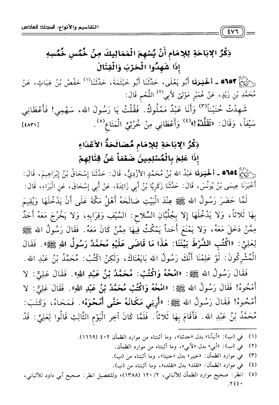 ٥٦٥٤ - أَخبَرنا عَبْدُ اللهِ بْنُ مُحَمَّدٍ الأَزْدِيُّ، قَالَ: حَدثنا إِسْحَاقُ بْنُ إِبْرَاهِيمَ، قَالَ: أَخبَرنا عِيسَى بْنُ يُونُسَ، قَالَ: حَدثنا زَكَرِيَّا بْنُ أَبِي زَائِدَةَ، عَنْ أَبِي إِسْحَاقَ، عَنِ الْبَرَاءِ، قَالَ: لَمَّا حَضَرَ رَسُولُ اللهِ صَلى الله عَلَيه وسَلم عِنْدَ الْبَيْتِ صَالَحَهُ أَهْلُ مَكَّةَ عَلى أَنْ يَدْخُلَهَا وَيُقِيمَ بِهَا ثَلَاثًا، وَلَا يَدْخُلَهَا إِلَاّ بِجُلُبَّانِ السِّلَاحِ: السَّيْفِ وَقِرَابِهِ، وَلَا يَخْرُجَ مَعَهُ أَحَدٌ مِمَّنْ دَخَلَ مَعَهُ، وَلَا يَمْنَعَ أَحَدًا يَمْكُثُ فِيهَا مِمَّنْ كَانَ مَعَهُ، فَقَالَ رَسُولُ اللهِ صَلى الله عَلَيه وسَلم لِعَلِيٍّ: "اكْتُبِ الشَّرْطَ بَيْنَنَا: هَذَا مَا قَاضَى عَلَيْهِ مُحَمَّدٌ رَسُولُ اللهِ صَلى الله عَلَيه وسَلم"، فَقَالَ الْمُشْرِكُونَ: لَوْ عَلِمْنَا أَنَّكَ رَسُولُ اللهِ بَايَعْنَاكَ، وَلَكِنْ اكْتُبْ: مُحَمَّدُ بْنُ عَبْدِ اللهِ،