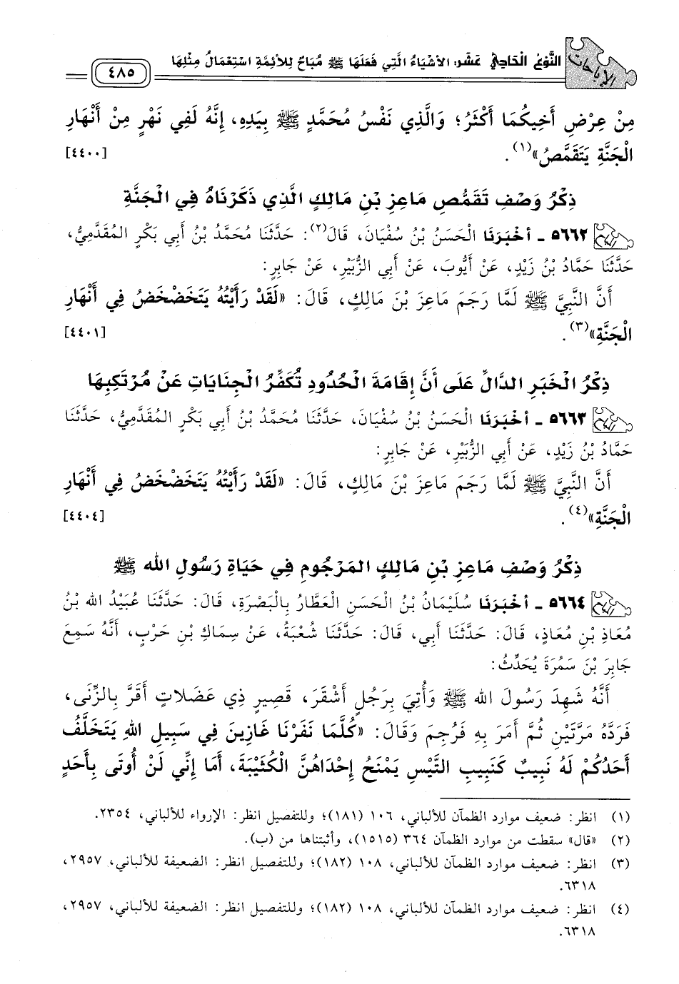 ٥٦٦٣ - أَخبَرنا الْحَسَنُ بْنُ سُفْيَانَ، حَدثنا مُحَمَّدُ بْنُ أَبِي بَكْرٍ الْمُقَدَّمِيُّ، حَدثنا حَمَّادُ بْنُ زَيْدٍ، عَنْ أَيُّوبَ، عَنْ أَبِي الزُّبَيْرِ، عَنْ جَابِرٍ، أَنَّ النَّبِيَّ صَلى الله عَلَيه وسَلم لَمَّا رَجَمَ مَاعِزَ بْنَ مَالِكٍ، قَالَ: "لَقَدْ رَأَيْتُهُ يَتَخَضْخَضُ فِي أَنْهَارِ الْجَنَّةِ". [٤٤٠٤]