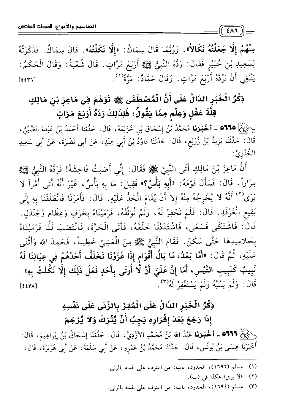 ٥٦٦٥ - أَخبَرنا مُحَمَّدُ بْنُ إِسْحَاقَ بْنِ خُزَيْمَةَ، قَالَ: حَدثنا أَحْمَدُ بْنُ عَبْدَةَ الضَّبِّيُّ، قَالَ: حَدثنا يَزِيدُ بْنُ زُرَيْعٍ، قَالَ: حَدثنا دَاوُدُ بْنُ أَبِي هِنْدٍ، عَنْ أَبِي نَضْرَةَ، عَنْ أَبِي سَعِيدٍ الْخُدْرِيِّ، أَنَّ مَاعِزَ بْنَ مَالِكٍ أَتَى النَّبِيَّ صَلى الله عَلَيه وسَلم فَقَالَ: إِنِّي أَصَبْتُ فَاحِشَةً، فَرَدَّهُ النَّبِيُّ صَلى الله عَلَيه وسَلم مِرَارًا، قَالَ: فَسَأَلَ قَوْمَهُ: "أَبِهِ بَأْسٌ؟ " فَقِيلَ: مَا بِهِ بَأْسٌ، غَيْرَ أَنَّهُ أَتَى أَمْرًا لا يَرَى أَنَّهُ لَا يُخْرِجُهُ مِنْهُ إِلَاّ أَنْ يُقَامَ الْحَدُّ عَلَيْهِ، قَالَ: فَأَمَرَنَا فَانْطَلَقْنَا بِهِ إِلَى بَقِيعِ الْغَرْقَدِ، قَالَ: فَلَمْ نَحْفِرْ لَهُ، وَلَمْ نُوثِقْهُ، فَرَمَيْنَاهُ بِخَزَفٍ وَعِظَامٍ وَجَنْدَلٍ، قَالَ: فَاشْتَكَى فَسَعَى، فَاشْتَدَدْنَا خَلْفَهُ، فَأَتَى الْحَرَّةَ، فَانْتَصَبَ لَنَا فَرَمَيْنَاهُ بِجَلَامِيدِهَا حَتَّى سَكَنَ، فَقَامَ النَّبِيُّ صَلى الله عَلَيه وسَلم مِنَ الْعَشِيِّ خَطِيبًا، فَحَمِدَ اللهَ وَأَثْنَى عَلَيْهِ، ثُمَّ قَالَ: "أَمَا بَعْدُ، مَا بَالَ أَقْوَامٍ إِذَا غَزَوْنَا تَخَلَّفَ أَحَدُهُمْ فِي عِيَالِنَا لَهُ نَبِيبٌ كَنَبِيبِ التَّيْسِ، أَمَا إِنَّ عَلَيَّ أَنْ لَا أُوتَى بِأَحَدٍ فَعَلَ ذَلِكَ إِلَاّ نَكَّلْتُ بِهِ"، قَالَ: وَلَمْ يَسُبَّهُ وَلَمْ يَسْتَغْفِرْ لَهُ. [٤٤٣٨]