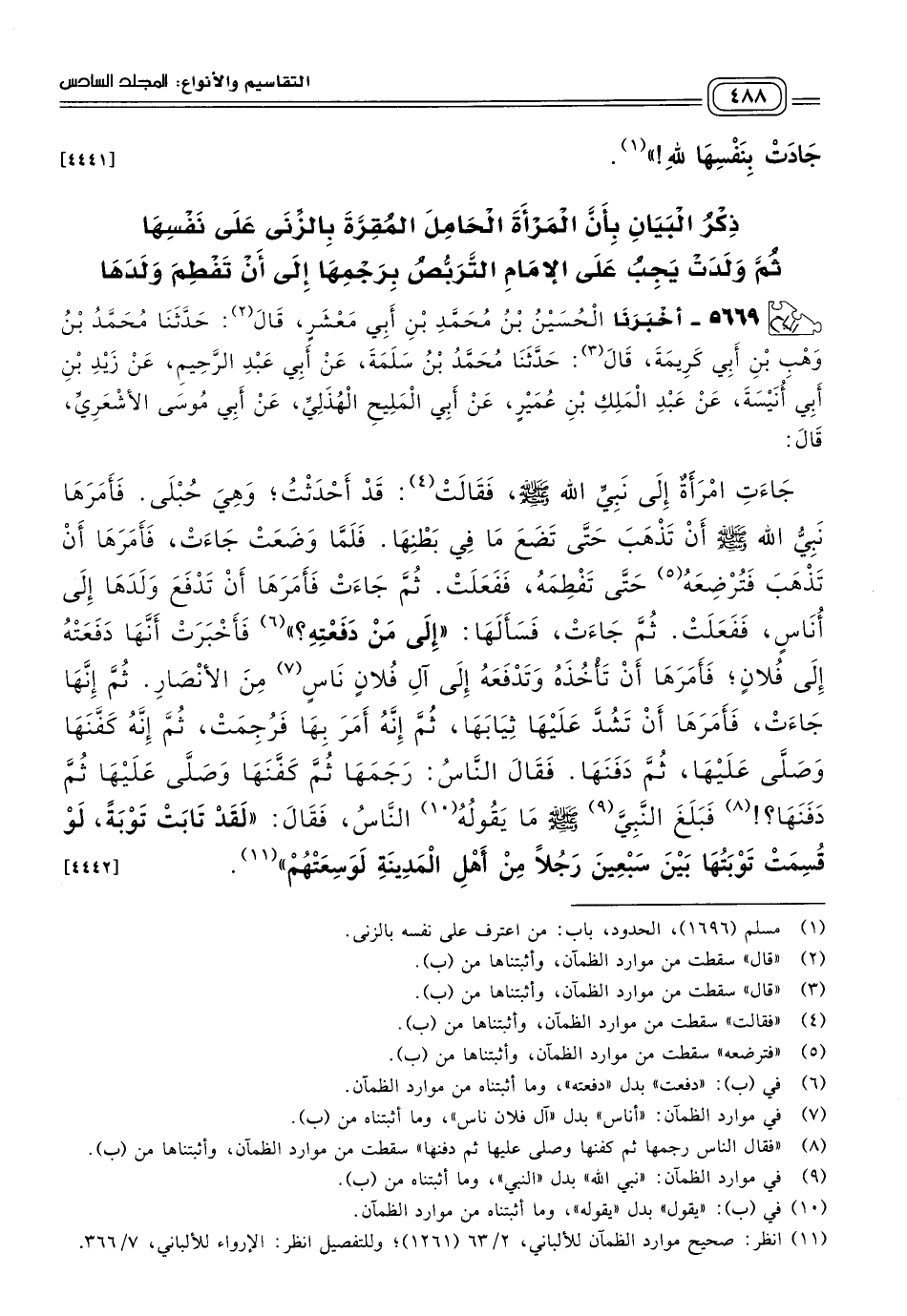 ٥٦٦٩ - أَخبَرنا الْحُسَيْنُ بْنُ مُحَمَّدِ بْنِ أَبِي مَعْشَرٍ، قَالَ: حَدثنا مُحَمَّدُ بْنُ وَهْبِ بْنِ أَبِي كَرِيمَةَ، قَالَ: حَدثنا مُحَمَّدُ بْنُ سَلَمَةَ، عَنْ أَبِي عَبْدِ الرَّحِيمِ، عَنْ زَيْدِ بْنِ أَبِي أُنَيْسَةَ، عَنْ عَبْدِ الْمَلِكِ بْنِ عُمَيْرٍ، عَنْ أَبِي الْمَلِيحِ الْهُذَلِيِّ، عَنْ أَبِي مُوسَى الأَشْعَرِيِّ قَالَ: جَاءَتِ امْرَأَةٌ إِلَى نَبِيِّ اللهِ صَلى الله عَلَيه وسَلم، فَقَالَتْ: قَدْ أَحْدَثْتُ، وَهِيَ حُبْلَى، فَأَمَرَهَا نَبِيُّ اللهِ صَلى الله عَلَيه وسَلم أَنْ تَذْهَبَ حَتَّى تَضَعَ مَا فِي بَطْنِهَا، فَلَمَّا وَضَعَتْ جَاءَتْ، فَأَمَرَهَا أَنْ تَذْهَبَ فَتُرْضِعَهُ حَتَّى تَفْطِمَهُ، فَفَعَلَتْ، ثُمَّ جَاءَتْ فَأَمَرَهَا أَنْ تَدْفَعَ وَلَدَهَا إِلَى أُنَاسٍ، فَفَعَلَتْ، ثُمَّ جَاءَتْ، فَسَأَلَهَا: "إِلَى مَنْ دَفَعْتِهِ؟ " فَأَخْبَرَتْ أَنَّهَا دَفَعَتْهُ إِلَى فُلَانٍ، فَأَمَرَهَا أَنْ تَأْخُذَهُ وَتَدْفَعَهُ إِلَى آلِ فُلَانٍ نَاسٍ مِنَ الأَنْصَارِ، ثُمَّ إِنَّهَا جَاءَتْ، فَأَمَرَهَا أَنْ تَشُدَّ عَلَيْهَا ثِيَابَهَا، ثُمَّ إِنَّهُ أَمَرَ بِهَا فَرُجِمَتْ، ثُمَّ إِنَّهُ كَفَّنَهَا وَصَلَّى عَلَيْهَا، ثُمَّ دَفَنَهَا، فَقَالَ النَّاسُ: رَجَمَهَا ثُمَّ كَفَّنَهَا وَصَلَّى عَلَيْهَا ثُمَّ دَفَنَهَا! فَبَلَغَ النَّبِيَّ صَلى الله عَلَيه وسَلم مَا يَقُولُهُ النَّاسُ، فَقَالَ: "لَقَدْ تَابَتْ تَوْبَةً، لَوْ قُسِمَتْ تَوْبَتُهَا بَيْنَ سَبْعِينَ رَجُلاً مِنْ أَهْلِ الْمَدِينَةِ لَوَسِعَتْهُمْ". [٤٤٤٢]