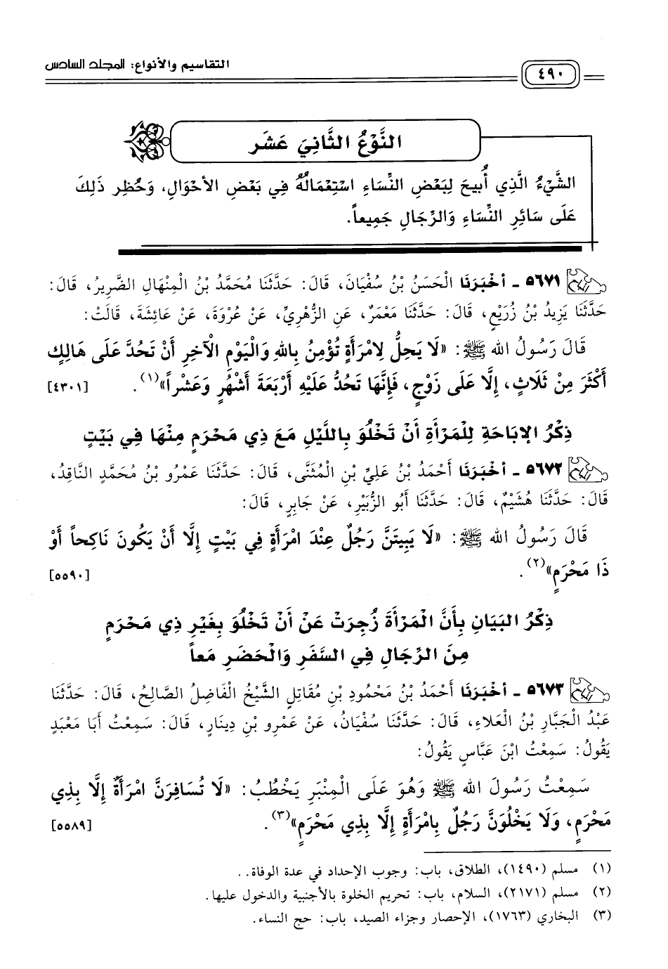٥٦٧٣ - أَخبَرنا أَحْمَدُ بْنُ مَحْمُودِ بْنِ مُقَاتِلٍ الشَّيْخُ الْفَاضِلُ الصَّالِحُ، قَالَ: حَدثنا عَبْدُ الْجَبَّارِ بْنُ الْعَلَاءِ، قَالَ: حَدثنا سُفْيَانُ، عَنْ عَمْرِو بْنِ دِينَارٍ، قَالَ: سَمِعْتُ أَبَا مَعْبَدٍ يَقُولُ: سَمِعْتُ ابْنَ عَبَّاسٍ يَقُولُ: سَمِعْتُ رَسُولَ اللهِ صَلى الله عَلَيه وسَلم وَهُوَ عَلَى الْمِنْبَرِ يَخْطُبُ: "لَا تُسَافِرَنَّ امْرَأَةٌ إِلَاّ بِذِي مَحْرَمٍ، وَلَا يَخْلُوَنَّ رَجُلٌ بِامْرَأَةٍ إِلَاّ بِذِي مَحْرَمٍ". [٥٥٨٩]