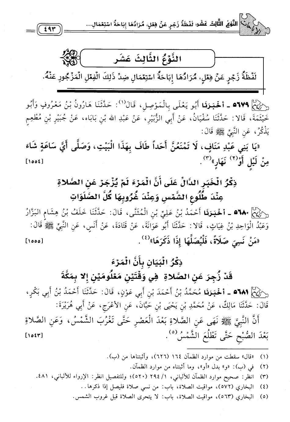 ٥٦٧٩ - أَخبَرنا أَبُو يَعْلَى، بِالْمَوْصِلِ، قَالَ: حَدثنا هَارُونُ بْنُ مَعْرُوفٍ، وَأَبُو خَيْثَمَةَ، قَالَا: حَدثنا سُفْيَانُ، عَنْ أَبِي الزُّبَيْرِ، عَنْ عَبْدِ اللهِ بْنِ بَابَاه، عَنْ جُبَيْرِ بْنِ مُطْعِمٍ، يَذْكُرُ عَنِ النَّبِيِّ صَلى الله عَلَيه وسَلم قَالَ: "يَا بَنِي عَبْدِ مَنَافٍ، لَا تَمْنَعُنَّ أَحَدًا طَافَ بِهَذَا الْبَيْتِ، وَصَلَّى أَيَّ سَاعَةٍ شَاءَ مِنْ لَيْلٍ أَوْ نَهَارٍ". [١٥٥٤]