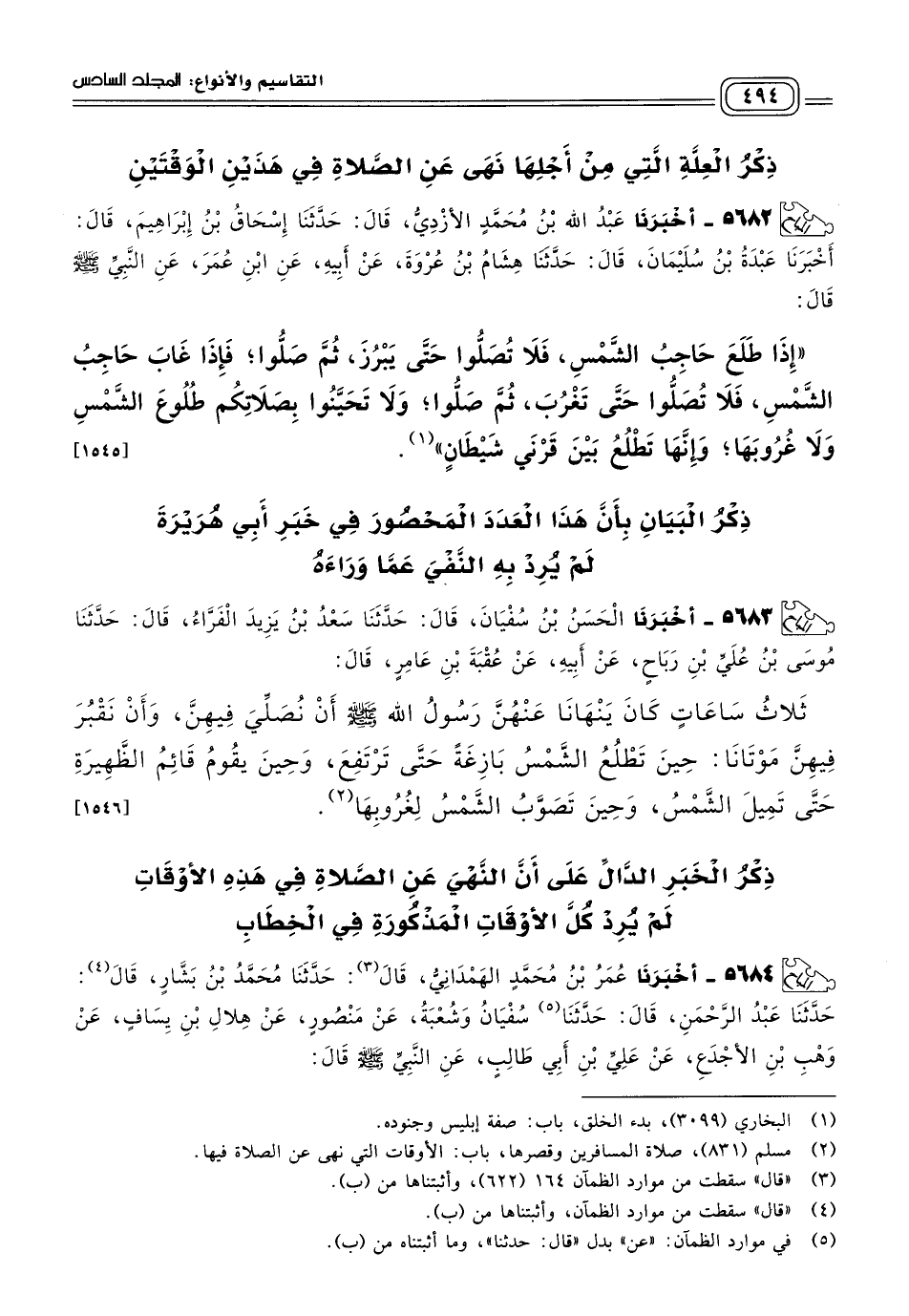٥٦٨٢ - أَخبَرنا عَبْدُ اللهِ بْنُ مُحَمَّدٍ الأَزْدِيُّ، قَالَ: حَدثنا إِسْحَاقُ بْنُ إِبْرَاهِيمَ، قَالَ: أَخبَرنا عَبْدَةُ بْنُ سُلَيْمَانَ، قَالَ: حَدثنا هِشَامُ بْنُ عُرْوَةَ، عَنْ أَبِيهِ، عَنِ ابْنِ عُمَرَ، عَنِ النَّبِيِّ صَلى الله عَلَيه وسَلم قَالَ: "إِذَا طَلَعَ حَاجِبُ الشَّمْسِ، فَلَا تُصَلُّوا حَتَّى يَبْرُزَ، ثُمَّ صَلُّوا، فَإِذَا غَابَ حَاجِبُ الشَّمْسِ، فَلَا تُصَلُّوا حَتَّى تَغْرُبَ، ثُمَّ صَلُّوا، وَلَا تَحَيَّنُوا بِصَلَاتِكُمْ طُلُوعَ الشَّمْسِ وَلَا غُرُوبَهَا، وَإِنَّهَا تَطْلُعُ بَيْنَ قَرْنَيْ شَيْطَانٍ". [١٥٤٥]