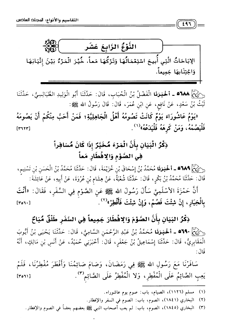 ٥٦٩٠ - أَخبَرنا مُحَمَّدُ بْنُ عَبْدِ الرَّحْمَنِ السَّامِيُّ، قَالَ: حَدثنا يَحْيَى بْنُ أَيُّوبَ الْمَقَابِرِيُّ، قَالَ: حَدثنا إِسْمَاعِيلُ بْنُ جَعْفَرٍ، قَالَ: أَخْبَرَنِي حُمَيْدٌ، عَنْ أَنَسِ بْنِ مَالِكٍ، أَنَّهُ قَالَ: سَافَرْنَا مَعَ رَسُولِ اللهِ صَلى الله عَلَيه وسَلم فِي رَمَضَانَ، وَصَامَ صَائِمُنَا وَأَفْطَرَ مُفْطِرُنَا، فَلَمْ يَعِبِ الصَّائِمُ عَلَى الْمُفْطِرِ، وَلَا الْمُفْطِرُ عَلَى الصَّائِمِ. [٣٥٦١]