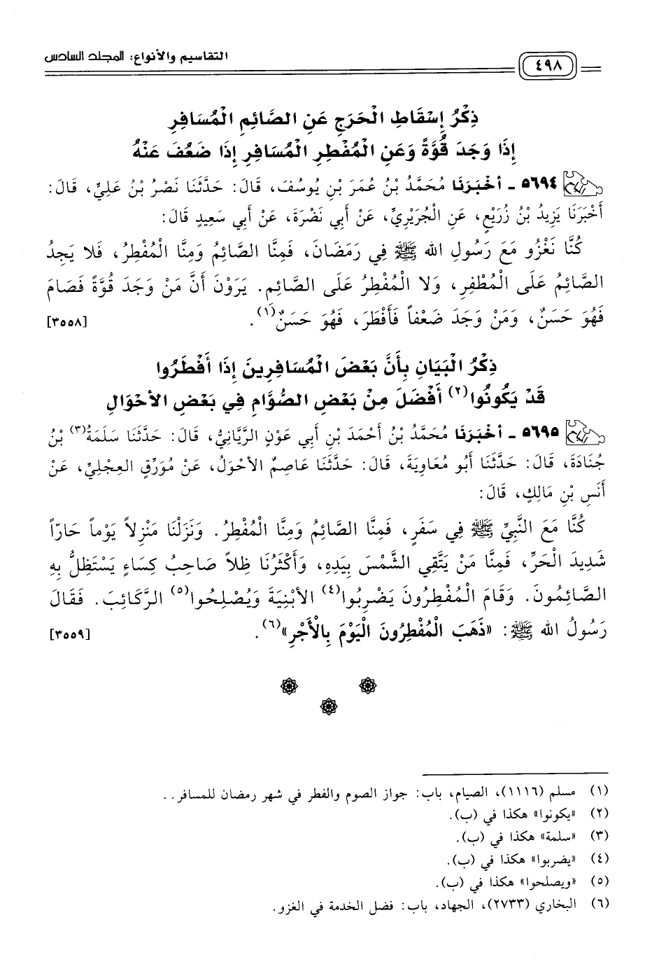 ٥٦٩٥ - أَخبَرنا مُحَمَّدُ بْنُ أَحْمَدَ بْنِ أَبِي عَوْنٍ الرَّيَّانِيُّ، قَالَ: حَدثنا سَلَمَةُ بْنُ جُنَادَةَ، قَالَ: حَدثنا أَبُو مُعَاوِيَةَ، قَالَ: حَدثنا عَاصِمٌ الأَحْوَلُ، عَنْ مُوَرِّقٍ الْعِجْلِيِّ، عَنْ أَنَسِ بْنِ مَالِكٍ، قَالَ: كُنَّا مَعَ النَّبِيِّ صَلى الله عَلَيه وسَلم فِي سَفَرٍ، فَمِنَّا الصَّائِمُ وَمِنَّا الْمُفْطِرُ، وَنَزَلْنَا مَنْزِلاً يَوْمًا حَارًّا شَدِيدَ الْحَرِّ، فَمِنَّا مِنْ يَتَّقِي الشَّمْسَ بِيَدِهِ، وَأَكْثَرُنَا ظِلاًّ صَاحِبُ كِسَاءٍ يَسْتَظِلُّ بِهِ الصَّائِمُونَ، وَقَامَ الْمُفْطِرُونَ يَضْرِبُوا الأَبْنِيَةَ وَيُصْلِحُوا الرَّكَائِبَ، فَقَالَ رَسُولُ اللهِ صَلى الله عَلَيه وسَلم: "ذَهَبَ الْمُفْطِرُونَ الْيَوْمَ بِالأَجْرِ". [٣٥٥٩]