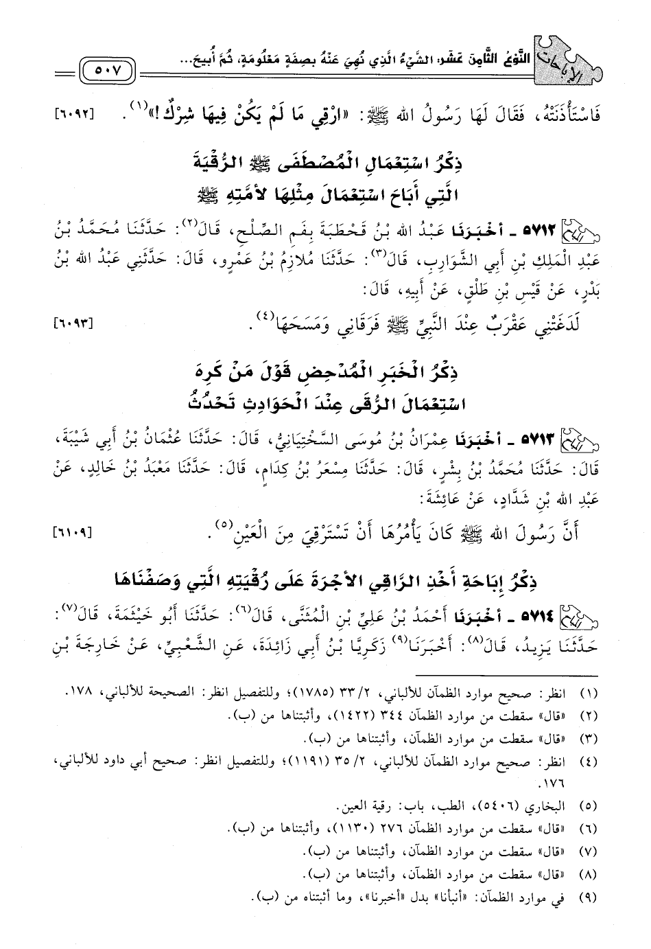 ذِكْرُ الْخَبَرِ الْمُدْحِضِ قَوْلَ مَنْ كَرِهَ اسْتِعْمَالَ الرُّقَى عِنْدَ الْحَوَادِثِ تَحْدُثُ.