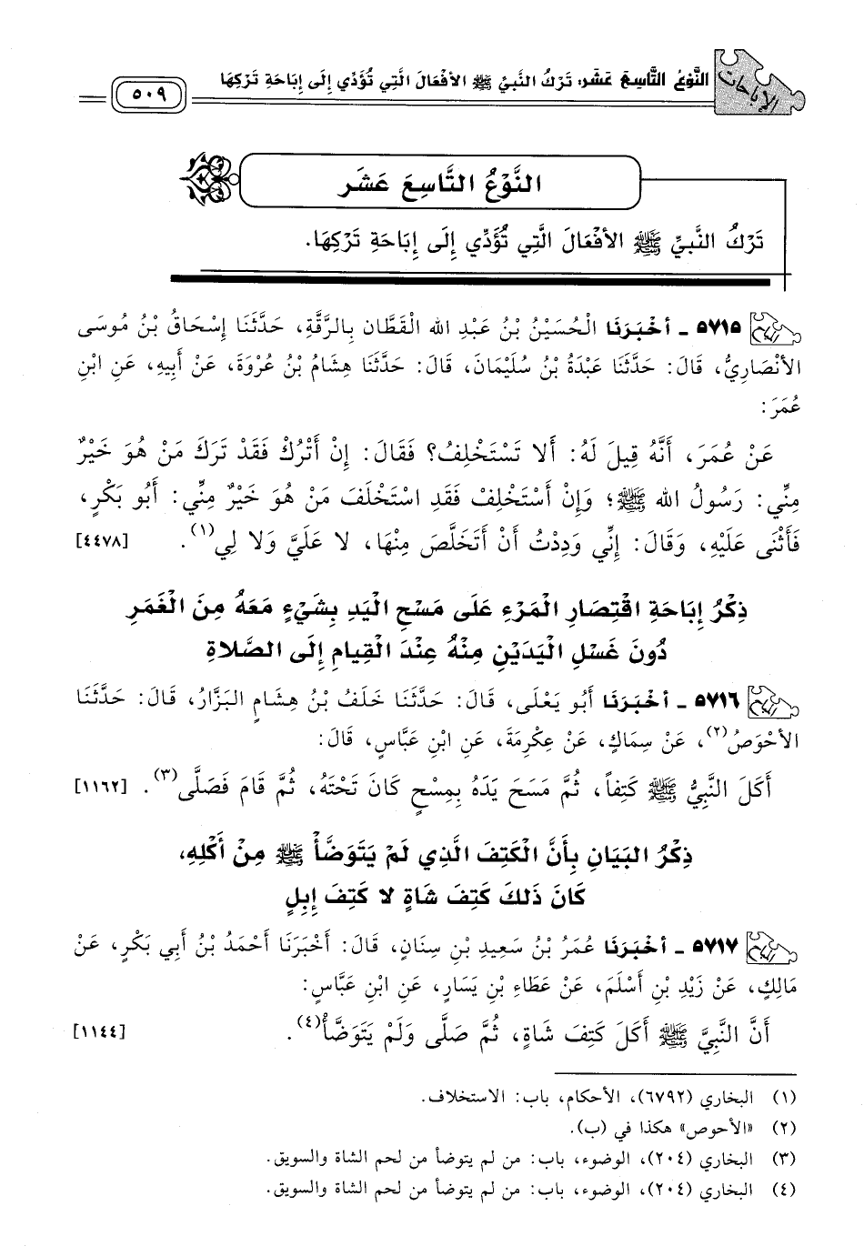 ٥٧١٧ - أَخبَرنا عُمَرُ بْنُ سَعِيدِ بْنِ سِنَانٍ، قَالَ: أَخبَرنا أَحْمَدُ بْنُ أَبِي بَكْرٍ، عَنْ مَالِكٍ، عَنْ زَيْدِ بْنِ أَسْلَمَ، عَنْ عَطَاءِ بْنِ يَسَارٍ، عَنِ ابْنِ عَبَّاسٍ؛ أَنَّ النَّبِيَّ صَلى الله عَلَيه وسَلم أَكَلَ كَتِفَ شَاةٍ، ثُمَّ صَلَّى وَلَمْ يَتَوَضَّأْ. [١١٤٤]
