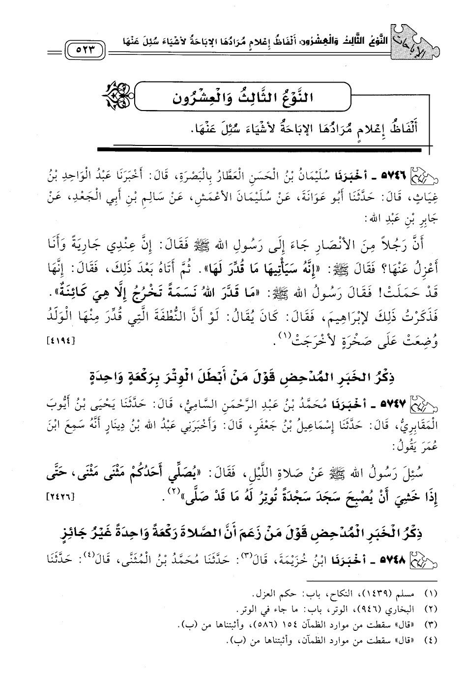 ٥٧٤٦ - أَخبَرنا سُلَيْمَانُ بْنُ الْحَسَنِ الْعَطَّارُ بِالْبَصْرَةِ، قَالَ: أَخبَرنا عَبْدُ الْوَاحِدِ بْنُ غِيَاثٍ، قَالَ: حَدثنا أَبُو عَوَانَةَ، عَنْ سُلَيْمَانَ الأَعْمَشِ، عَنْ سَالِمِ بْنِ أَبِي الْجَعْدِ، عَنْ جَابِرِ بْنِ عَبْدِ اللهِ، أَنَّ رَجُلاً مِنَ الأَنْصَارِ جَاءَ إِلَى رَسُولِ اللهِ صَلى الله عَلَيه وسَلم فَقَالَ: إِنَّ عِنْدِي جَارِيَةً وَأَنَا أَعْزِلُ عَنْهَا، فَقَالَ صَلى الله عَلَيه وسَلم: "إِنَّهُ سَيَأْتِيهَا مَا قُدِّرَ لَهَا"، ثُمَّ أَتَاهُ بَعْدَ ذَلِكَ، فَقَالَ: إِنَّهَا قَدْ حَمَلَتْ، فَقَالَ رَسُولُ اللهِ صَلى الله عَلَيه وسَلم: "مَا قَدَّرَ اللهُ نَسَمَةً تَخْرُجُ إِلَاّ هِيَ كَائِنَةٌ".