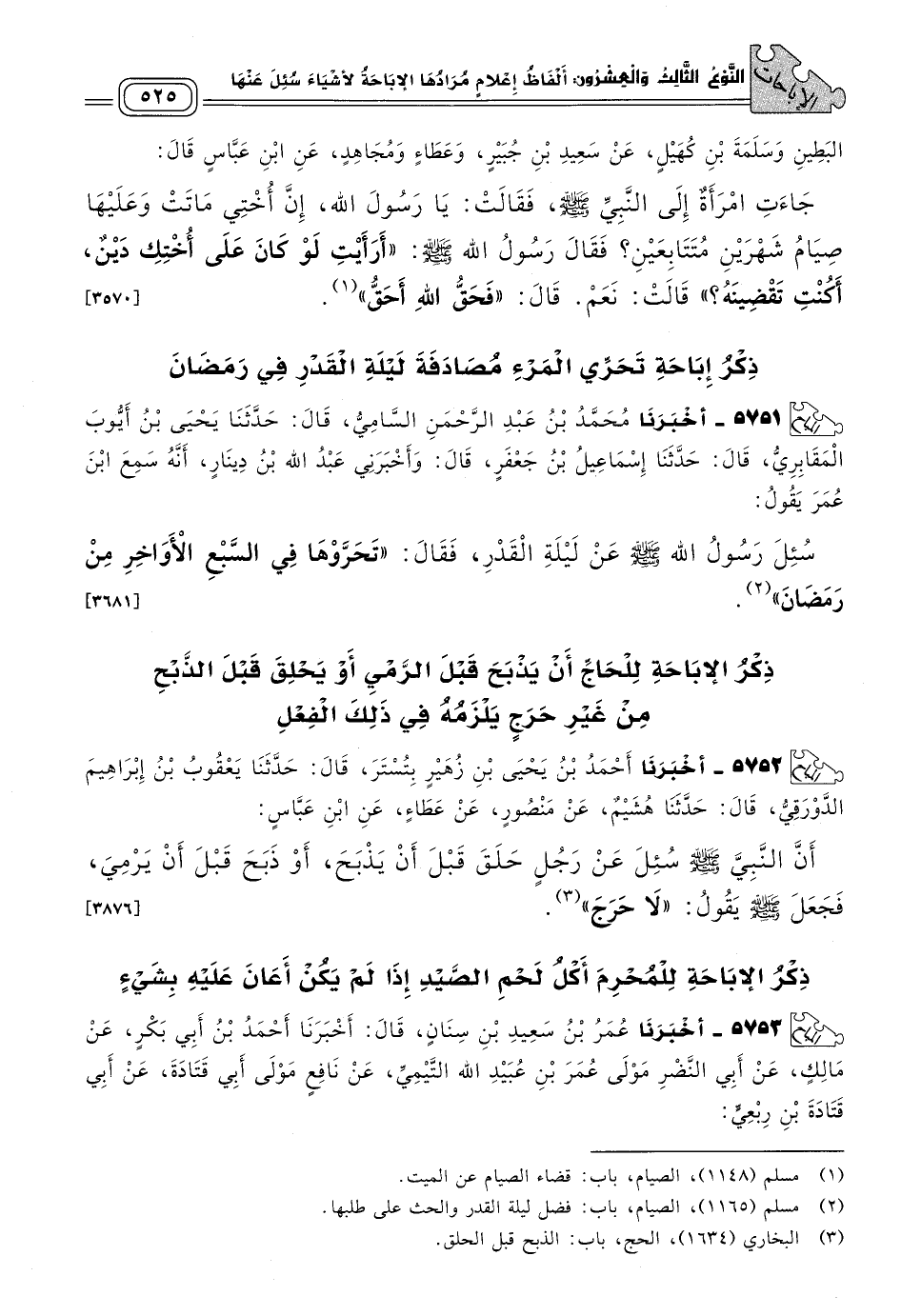 ٥٧٥٢ - أَخبَرنا أَحْمَدُ بْنُ يَحْيَى بْنِ زُهَيْرٍ بِتُسْتَرَ، قَالَ: حَدثنا يَعْقُوبُ بْنُ إِبْرَاهِيمَ الدَّوْرَقِيُّ، قَالَ: حَدثنا هُشَيْمٌ، عَنْ مَنْصُورٍ، عَنْ عَطَاءٍ، عَنِ ابْنِ عَبَّاسٍ، أَنَّ النَّبِيَّ صَلى الله عَلَيه وسَلم سُئِلَ عَنْ رَجُلٍ حَلَقَ قَبْلَ أَنْ يَذْبَحَ، أَوْ ذَبَحَ قَبْلَ أَنْ يَرْمِيَ، فَجَعَلَ صَلى الله عَلَيه وسَلم يَقُولُ: "لَا حَرَجَ". [٣٨٧٦]