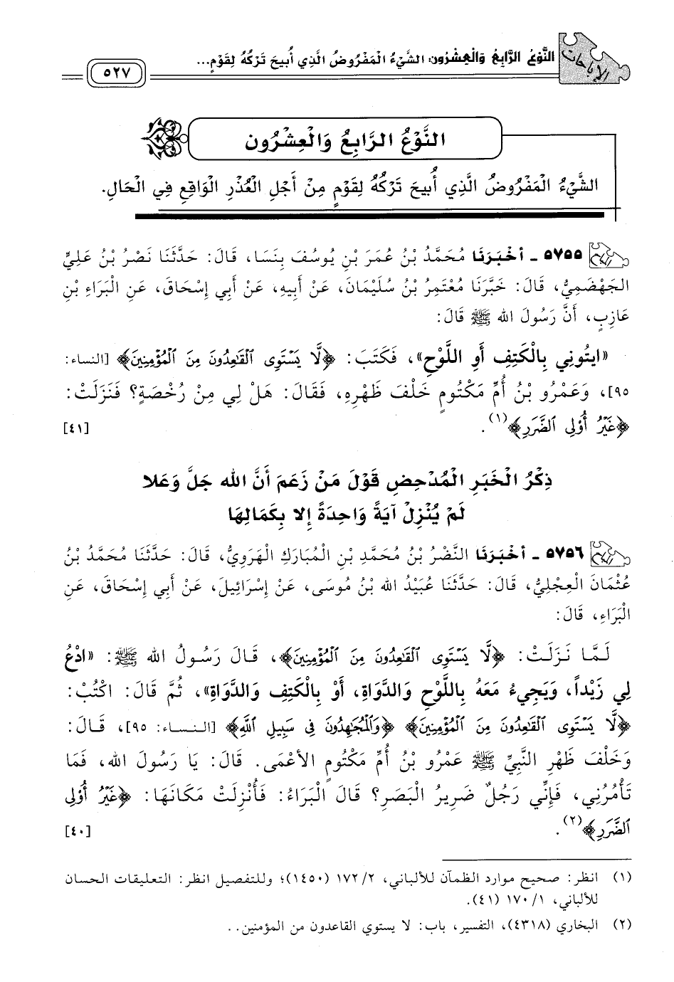 ٥٧٥٦ - أَخبَرنا النَّضْرُ بْنُ مُحَمَّدِ بْنِ الْمُبَارَكِ الْهَرَوِيُّ، قَالَ: حَدثنا مُحَمَّدُ بْنُ عُثْمَانَ الْعِجْلِيُّ، قَالَ: حَدثنا عُبَيْدُ اللهِ بْنُ مُوسَى، عَنْ إِسْرَائِيلَ، عَنْ أَبِي إِسْحَاقَ، عَنِ الْبَرَاءِ، قَالَ: لَمَّا نَزَلَتْ: {لَا يَسْتَوِي الْقَاعِدُونَ مِنَ الْمُؤْمِنِينَ} [النساء: ٩٥]، قَالَ رَسُولُ اللهِ صَلى الله عَلَيه وسَلم: "ادْعُ لِي زَيْدًا، وَيَجِيءُ مَعَهُ بِاللَّوْحِ وَالدَّوَاةِ، أَوْ بِالْكَتِفِ وَالدَّوَاةِ"، ثُمَّ قَالَ: "اكْتُبْ: لَا يَسْتَوِي الْقَاعِدُونَ مِنَ الْمُؤْمِنِينَ وَالْمُجَاهِدُونَ فِي سَبِيلِ اللهِ، قَالَ: وَخَلْفَ ظَهْرِ النَّبِيِّ صَلى الله عَلَيه وسَلم عَمْرُو بْنُ أُمِّ مَكْتُومٍ الأَعْمَى، قَالَ: يَا رَسُولَ اللهِ، فَمَا تَأْمُرُنِي، فَإِنِّي رَجُلٌ ضَرِيرُ الْبَصَرِ؟ قَالَ الْبَرَاءُ: فَأُنْزِلَتْ مَكَانَهَا: {غَيْرُ أُولِي الضَّرَرِ}. [٤٠]