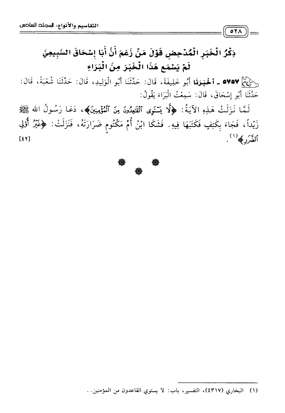 ٥٧٥٧ - أَخبَرنا أَبُو خَلِيفَةَ، قَالَ: حَدثنا أَبُو الْوَلِيدِ، قَالَ: حَدثنا شُعْبَةُ، قَالَ: حَدثنا أَبُو إِسْحَاقَ، قَالَ: سَمِعْتُ الْبَرَاءَ يَقُولُ: لَمَّا نَزَلَتْ هَذِهِ الآيَةُ: {لَا يَسْتَوِي الْقَاعِدُونَ مِنَ الْمُؤْمِنِينَ}، دَعَا رَسُولُ اللهِ صَلى الله عَلَيه وسَلم زَيْدًا، فَجَاءَ بِكَتِفٍ فَكَتَبَهَا فِيهِ، فَشَكَا ابْنُ أُمِّ مَكْتُومٍ ضَرَارَتَهُ، فَنَزَلَتْ: {غَيْرُ أُولِي الضَّرَرِ}. [٤٢]