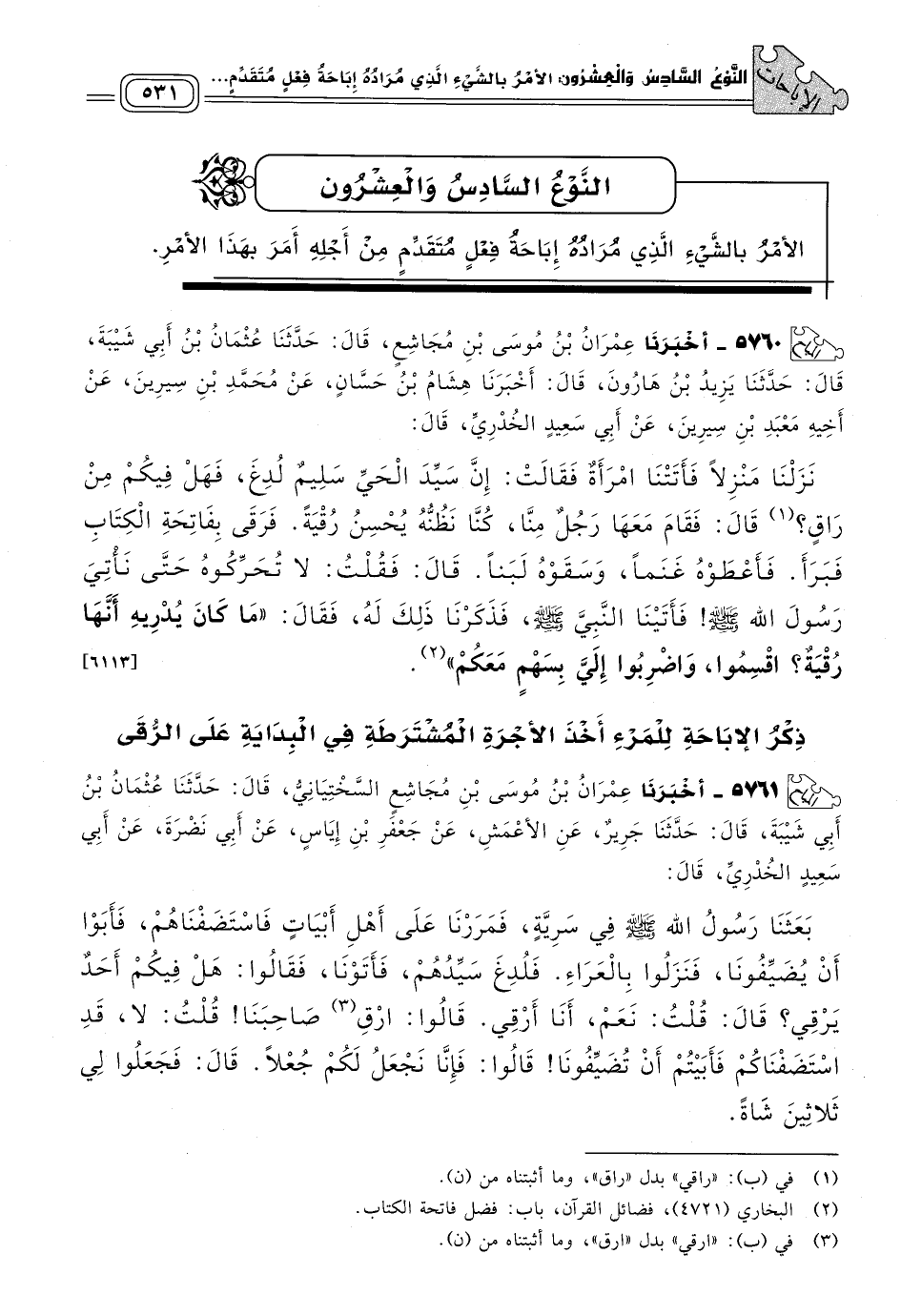 ٥٧٦٠ - أَخبَرنا عِمْرَانُ بْنُ مُوسَى بْنِ مُجَاشِعٍ، قَالَ: حَدثنا عُثْمَانُ بْنُ أَبِي شَيْبَةَ، قَالَ: حَدثنا يَزِيدُ بْنُ هَارُونَ، قَالَ: أَخبَرنا هِشَامُ بْنُ حَسَّانَ، عَنْ مُحَمَّدِ بْنِ سِيرِينَ، عَنْ أَخِيهِ مَعْبَدِ بْنِ سِيرِينَ، عَنْ أَبِي سَعِيدٍ الْخُدْرِيِّ، قَالَ: نَزَلْنَا مَنْزِلاً فَأَتَتْنَا امْرَأَةٌ فَقَالَتْ: إِنَّ سَيِّدَ الْحَيِّ سَلِيمٌ لُدِغَ، فَهَلْ فِيكُمْ مِنْ رَاقٍ؟ قَالَ: فَقَامَ مَعَهَا رَجُلٌ مِنَّا، كُنَّا نَظُنُّهُ يُحْسِنُ رُقْيَةً، فَرَقَى بِفَاتِحَةِ الْكِتَابِ فَبَرَأَ، فَأَعْطَوْهُ غَنَمًا، وَسَقَوْهُ لَبَنًا، قَالَ: فَقُلْتُ: لَا تُحَرِّكُوهُ حَتَّى نَأْتِيَ رَسُولَ اللهِ صَلى الله عَلَيه وسَلم، فَأَتَيْنَا النَّبِيَّ صَلى الله عَلَيه وسَلم فَذَكَرْنَا ذَلِكَ لَهُ، فَقَالَ: "مَا كَانَ يُدْرِيهِ أَنَّهَا رُقْيَةٌ؟ اقْسِمُوا، وَاضْرِبُوا إِلَيَّ بِسَهْمٍ مَعَكُمْ". [٦١١٣]