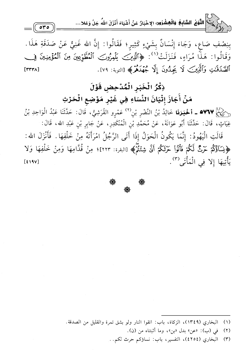 ٥٧٦٧ - أَخبَرنا خَالِدُ بْنُ النَّضْرِ بْنِ عَمْرٍو الْقُرَشِيُّ، قَالَ: حَدثنا عَبْدُ الْوَاحِدِ بْنُ غِيَاثٍ، قَالَ: حَدثنا أَبُو عَوَانَةَ، عَنْ مُحَمَّدِ بْنِ الْمُنْكَدِرِ، عَنْ جَابِرِ بْنِ عَبْدِ اللهِ، قَالَ: قَالَتِ الْيَهُودُ: إِنَّمَا يَكُونُ الْحَوَلُ إِذَا أَتَى الرَّجُلُ امْرَأَتَهُ مِنْ خَلْفِهَا، فَأَنْزَلَ اللهُ: {نِسَاؤُكُمْ حَرْثٌ لَكُمْ فَأْتُوا حَرْثَكُمْ أَنَّى شِئْتُمْ} [البقرة: ٢٢٣]، مِنْ قُدَّامِهَا وَمِنْ خَلْفِهَا وَلَا يَأْتِيهَا إِلَاّ فِي الْمَأْتَى. [٤١٩٧]