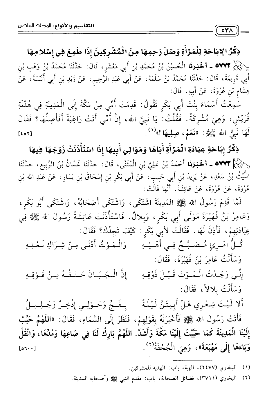 ٥٧٧٣ - أَخبَرنا أَحْمَدُ بْنُ عَلِيِّ بْنِ الْمُثَنَّى، قَالَ: حَدثنا غَسَّانُ بْنُ الرَّبِيعِ، حَدثنا اللَّيْثُ بْنُ سَعْدٍ، عَنْ يَزِيدَ بْنِ أَبِي حَبِيبٍ، عَنْ أَبِي بَكْرِ بْنِ إِسْحَاقَ بْنِ يَسَارٍ، عَنْ عَبْدِ اللهِ بْنِ عُرْوَةَ، عَنْ عُرْوَةَ، عَنْ عَائِشَةَ، أَنَّهَا قَالَتْ: لَمَّا قَدِمَ رَسُولُ اللهِ صَلى الله عَلَيه وسَلم الْمَدِينَةَ اشْتَكَى، وَاشْتَكَى أَصْحَابُهُ، وَاشْتَكَى أَبُو بَكْرٍ، وَعَامِرُ بْنُ فُهَيْرَةَ مَوْلَى أَبِي بَكْرٍ، وَبِلَالٌ، فَاسْتَأْذَنَتْ عَائِشَةُ رَسُولَ اللهِ صَلى الله عَلَيه وسَلم فِي عِيَادَتِهِمْ، فَأَذِنَ لَهَا، فَقَالَتْ لأَبِي بَكْرٍ: كَيْفَ تَجِدُكَ؟ فَقَالَ: