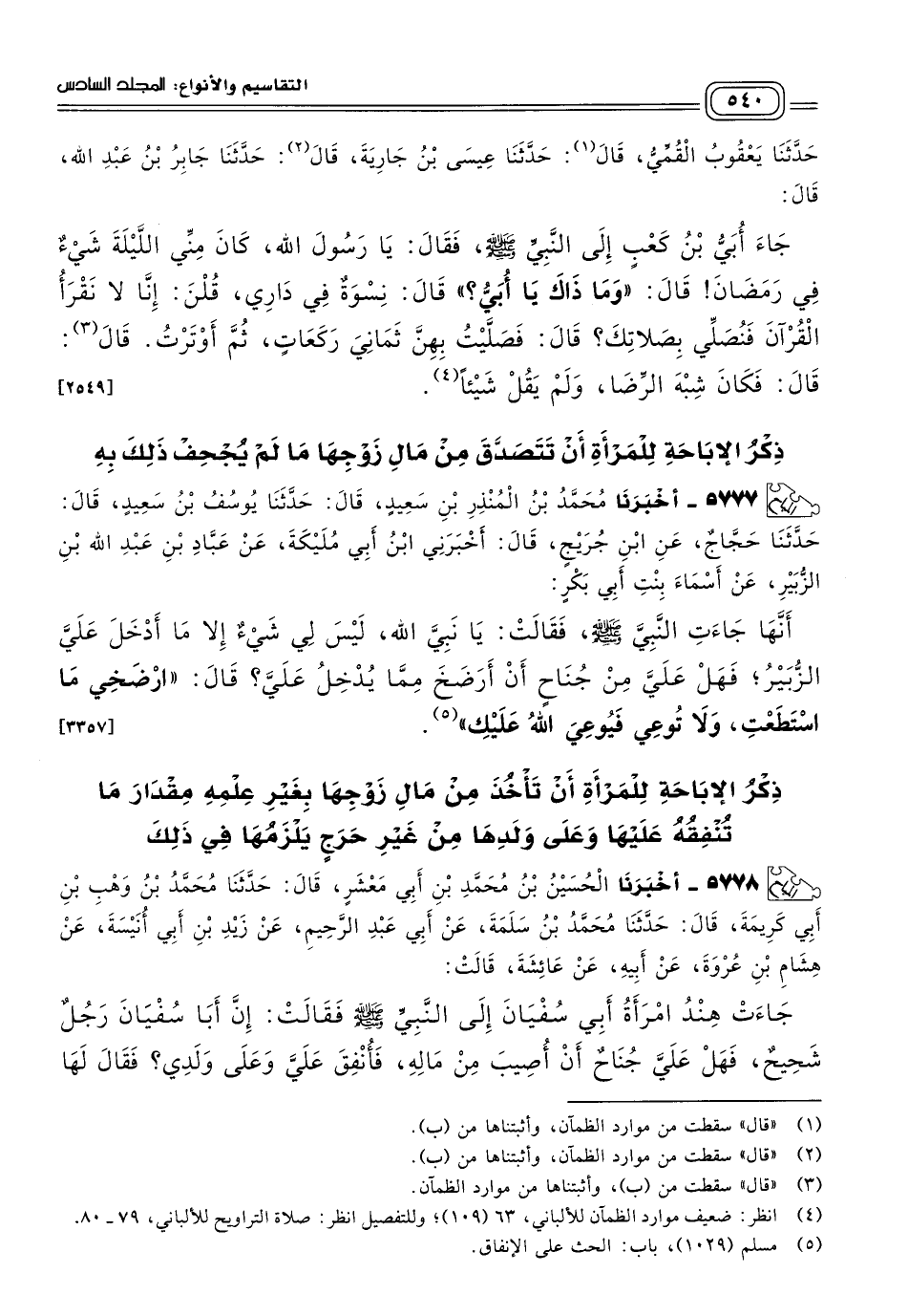 ٥٧٧٨ - أَخبَرنا الْحُسَيْنُ بْنُ مُحَمَّدِ بْنِ أَبِي مَعْشَرٍ، قَالَ: حَدثنا مُحَمَّدُ بْنُ وَهْبِ بْنِ أَبِي كَرِيمَةَ، قَالَ: حَدثنا مُحَمَّدُ بْنُ سَلَمَةَ، عَنْ أَبِي عَبْدِ الرَّحِيمِ، عَنْ زَيْدِ بْنِ أَبِي أُنَيْسَةَ، عَنْ هِشَامِ بْنِ عُرْوَةَ، عَنْ أَبِيهِ، عَنْ عَائِشَةَ، قَالَتْ: جَاءَتْ هِنْدُ امْرَأَةُ أَبِي سُفْيَانَ إِلَى النَّبِيِّ صَلى الله عَلَيه وسَلم فَقَالَتْ: إِنَّ أَبَا سُفْيَانَ رَجُلٌ شَحِيحٌ، فَهَلْ عَلَيَّ جُنَاحٌ أَنْ أُصِيبَ مِنْ مَالِهِ، فَأُنْفِقَ عَلَيَّ وَعَلَى وَلَدِي؟ فَقَالَ لَهَا نَبِيُّ اللهِ صَلى الله عَلَيه وسَلم: "لَا حَرَجَ عَلَيْكِ أَنْ تَأْخُذِي مِنْ مَالِ أَبِي سُفْيَانَ فَتُنْفِقِيهِ عَلَيْكِ وَعَلَى وَلَدِكِ بِالْمَعْرُوفِ". [٤٢٥٨]