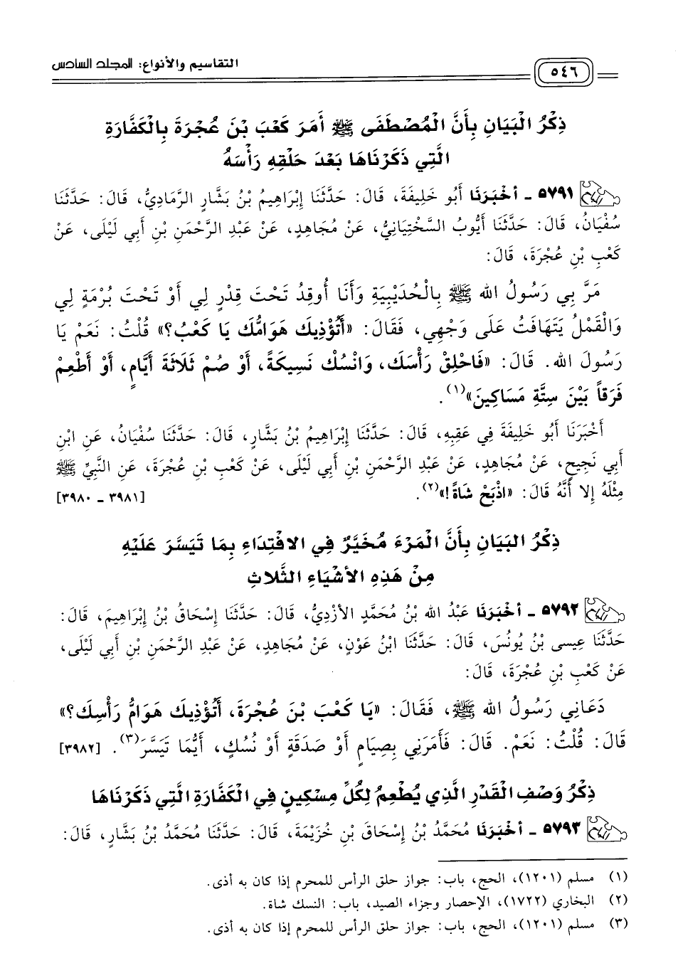 ٥٧٩٣ - أَخبَرنا مُحَمَّدُ بْنُ إِسْحَاقَ بْنِ خُزَيْمَةَ، قَالَ: حَدثنا مُحَمَّدُ بْنُ بَشَّارٍ، قَالَ: حَدثنا عَبْدُ الْوَهَّابِ الثَّقَفِيُّ، قَالَ: حَدثنا خَالِدٌ، عَنْ أَبِي قِلَابَةَ، عَنْ عَبْدِ الرَّحْمَنِ بْنِ أَبِي لَيْلَى، عَنْ كَعْبِ بْنِ عُجْرَةَ، قَالَ: أَتَى عَلَيَّ رَسُولُ اللهِ صَلى الله عَلَيه وسَلم زَمَنَ الْحُدَيْبِيَةِ وَأَنَا كَثِيرُ الشَّعْرِ، فَقَالَ: "كَأَنَّ هَوَامَّ رَأْسِكَ تُؤْذِيكَ؟ " فَقُلْتُ: أَجَلْ، قَالَ: "فَاحْلِقْهُ، وَاذْبَحْ شَاةً نَسِيكَةً، أَوْ صُمْ ثَلَاثَةَ أَيَّامٍ، أَوْ تَصَدَّقْ بِثَلَاثَةِ آصُعِ تَمْرٍ بَيْنَ سِتَّةِ مَسَاكِينَ". [٣٩٨٤]
