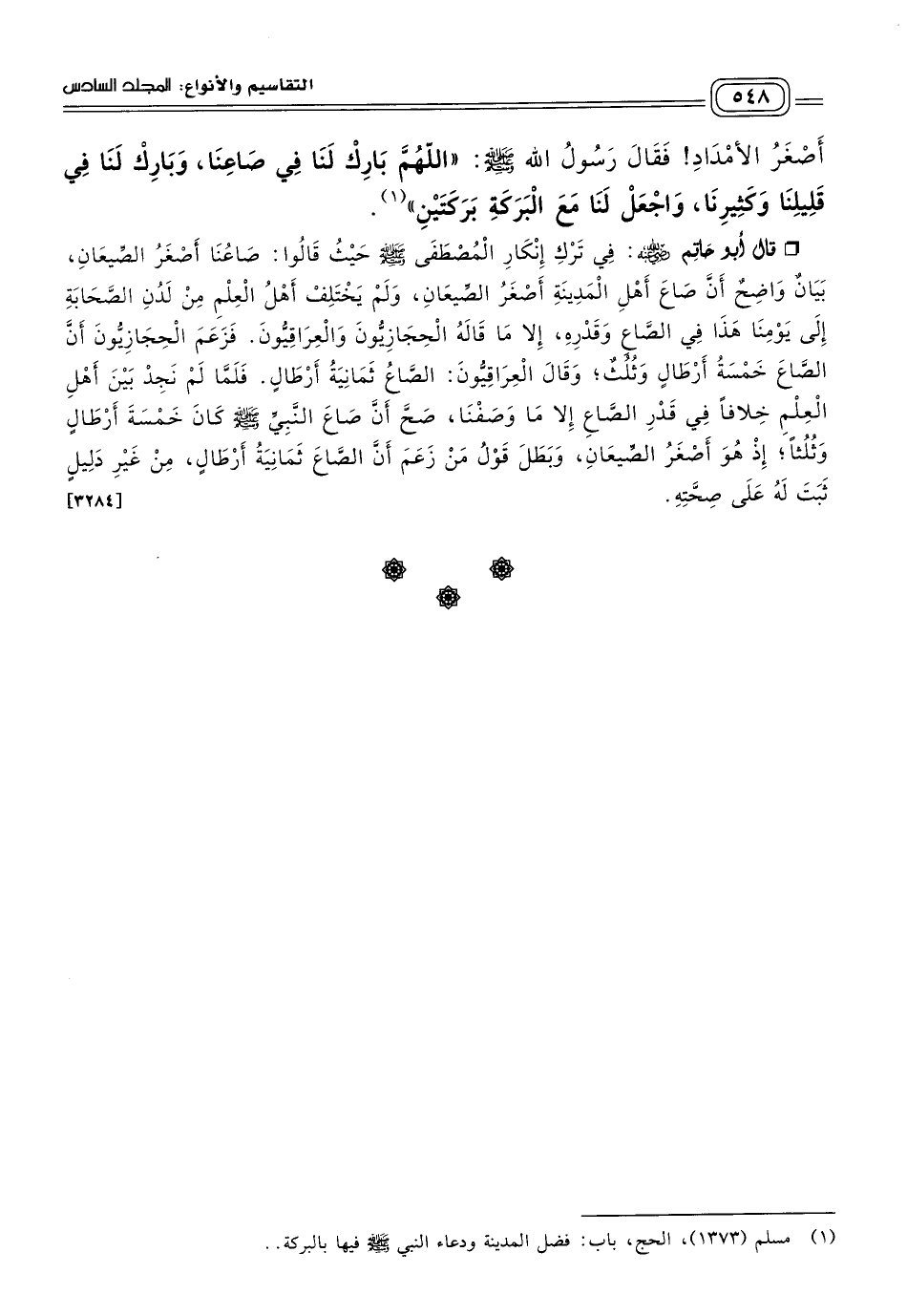 قَالَ أَبُو حَاتِمٍ رَضِيَ اللهُ عَنْهُ: فِي تَرْكِ إِنْكَارِ الْمُصْطَفَى صَلى الله عَلَيه وسَلم حَيْثُ قَالُوا: صَاعُنَا أَصْغَرُ الصِّيعَانِ، بَيَانٌ وَاضِحٌ أَنَّ صَاعَ أَهْلِ الْمَدِينَةِ أَصْغَرُ الصِّيعَانِ، وَلَمْ يَخْتَلِفْ أَهْلُ الْعِلْمِ مِنْ لَدُنِ الصَّحَابَةِ إِلَى يَوْمِنَا هَذَا فِي الصَّاعِ وَقَدْرِهِ، إِلَاّ مَا قَالَهُ الْحِجَازِيُّونَ وَالْعِرَاقِيُّونَ، فَزَعَمَ الْحِجَازِيُّونَ أَنَّ الصَّاعَ خَمْسَةُ أَرْطَالٍ وَثُلُثٌ، وَقَالَ الْعِرَاقِيُّونَ: الصَّاعُ ثَمَانِيَةُ أَرْطَالٍ، فَلَمَّا لَمْ نَجِدْ بَيْنَ أَهْلِ الْعِلْمِ خِلَافًا فِي قَدْرِ الصَّاعِ إِلَاّ مَا وَصَفْنَا، صَحَّ أَنَّ صَاعَ النَّبِيِّ صَلى الله عَلَيه وسَلم كَانَ خَمْسَةَ أَرْطَالٍ وَثُلُثًا، إِذْ هُوَ أَصْغَرُ الصِّيعَانِ، وَبَطَلَ قَوْلُ مَنْ زَعَمَ أَنَّ الصَّاعَ ثَمَانِيَةُ أَرْطَالٍ، مِنْ غَيْرِ دَلِيلٍ ثَبَتَ لَهُ عَلَى صِحَّتِهِ. [٣٢٨٤]
