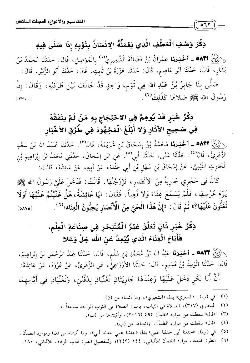 ٥٨٢٢ - أَخبَرنا مُحَمَّدُ بْنُ إِسْحَاقَ بْنِ خُزَيْمَةَ، قَالَ: حَدثنا عُبَيْدُ اللهِ بْنُ سَعْدٍ الزُّهْرِيُّ، قَالَ: حَدثنا عَمِّي، حَدثنا أَبِي، عَنِ ابْنِ إِسْحَاقَ، حَدَّثَنِي مُحَمَّدُ بْنُ إِبْرَاهِيمَ بْنِ الْحَارِثِ التَّيْمِيُّ، عَنْ إِسْحَاقَ بْنِ سَهْلِ بْنِ أَبِي حَثْمَةَ، عَنْ أَبِيهِ، عَنْ عَائِشَةَ، قَالَتْ: كَانَ فِي حِجْرِي جَارِيَةٌ مِنَ الأَنْصَارِ، فَزَوَّجْتُهَا، قَالَتْ: فَدَخَلَ عَلَيَّ رَسُولُ اللهِ صَلى الله عَلَيه وسَلم يَوْمَ عُرْسِهَا، فَلَمْ يَسْمَعْ غِنَاءً وَلَا لَعِبًا، فَقَالَ: "يَا عَائِشَةُ، هَلْ غَنَّيْتُمْ عَلَيْهَا أَوَلَا تُغَنُّونَ عَلَيْهَا؟ " ثُمَّ قَالَ: "إِنَّ هَذَا الْحَيَّ مِنَ الأَنْصَارِ يُحِبُّونَ الْغِنَاءَ". [٥٨٧٥]