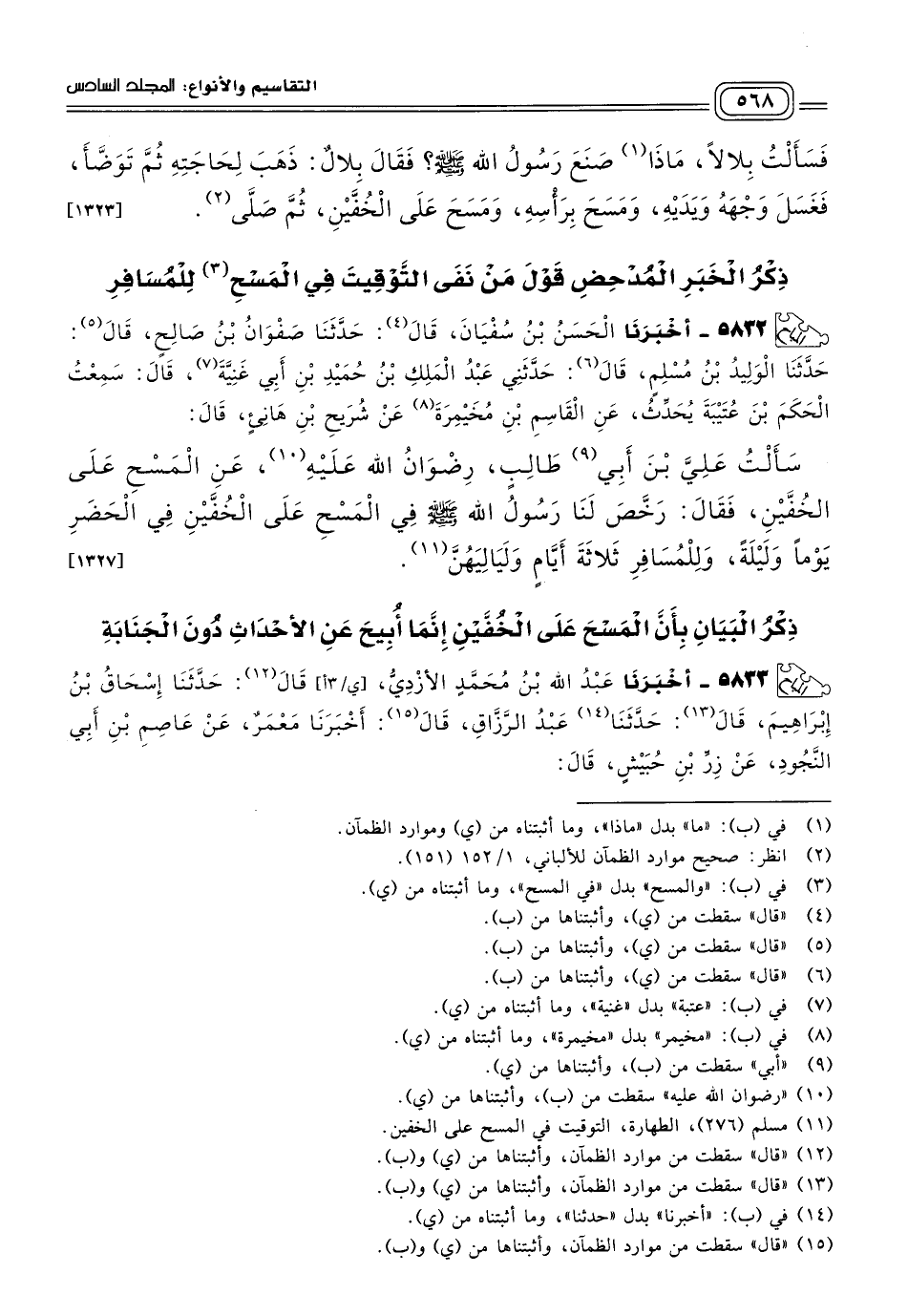 ٥٨٣٢ - أَخبَرنا الْحَسَنُ بْنُ سُفْيَانَ، قَالَ: حَدثنا صَفْوَانُ بْنُ صَالِحٍ، قَالَ: حَدثنا الْوَلِيدُ بْنُ مُسْلِمٍ، قَالَ: حَدَّثَنِي عَبْدُ الْمَلِكِ بْنُ حُمَيْدِ بْنِ أَبِي غَنِيَّةَ، قَالَ: سَمِعْتُ الْحَكَمَ بْنَ عُتَيْبَةَ، يُحَدِّثُ عَنِ الْقَاسِمِ بْنِ مُخَيْمِرَةَ، عَنْ شُرَيْحِ بْنِ هَانِئٍ، قَالَ: سَأَلْتُ عَلِيَّ بْنَ أَبِي طَالِبٍ رِضْوَانُ اللهِ عَلَيْهِ عَنِ الْمَسْحِ عَلَى الْخُفَّيْنِ، فَقَالَ: رَخَّصَ لَنَا رَسُولُ اللهِ صَلى الله عَلَيه وسَلم فِي الْمَسْحِ عَلَى الْخُفَّيْنِ فِي الْحَضَرِ يَوْمًا وَلَيْلَةً، وَلِلْمُسَافِرِ ثَلَاثَةَ أَيَّامٍ وَلَيَالِيَهُنَّ. [١٣٢٧]