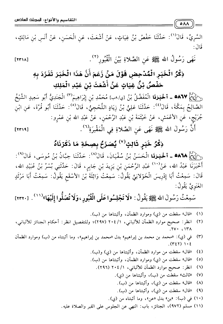 ٥٨٦٧ - أَخبَرنا الْمُفَضَّلُ بْنُ مُحَمَّدِ بْنِ إِبْرَاهِيمَ الْجَنَدِيُّ أَبُو سَعِيدٍ الشَّيْخُ الصَّالِحُ بِمَكَّةَ، قَالَ: حَدثنا عَلِيُّ بْنُ زِيَادٍ اللَّحْجِيُّ، قَالَ: حَدثنا أَبُو قُرَّةَ، عَنِ ابْنِ جُرَيْجٍ، عَنِ الأَعْمَشِ، عَنْ خَيْثَمَةَ بْنِ عَبْدِ الرَّحْمَنِ، عَنْ عَبْدِ اللهِ بْنِ عَمْرٍو، أَنَّ رَسُولَ اللهِ صَلى الله عَلَيه وسَلم نَهَى عَنِ الصَّلَاةِ فِي الْمَقْبَرَةِ. [٢٣١٩]