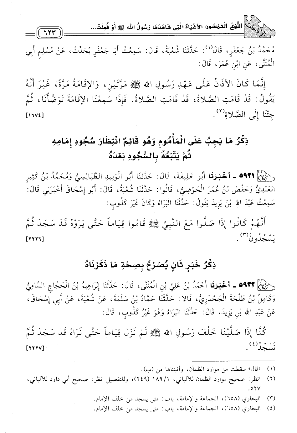 ٥٩٣٢ - أَخبَرنا أَحْمَدُ بْنُ عَلِيِّ بْنِ الْمُثَنَّى، قَالَ: حَدثنا إِبْرَاهِيمُ بْنُ الْحَجَّاجِ السَّامِيُّ، وكامِلُ بْنُ طَلْحَةَ الْجَحْدَرِيُّ، قَالَا: حَدثنا حَمَّادُ بْنُ سَلَمَةَ، عَنْ شُعْبَةَ، عَنْ أَبِي إِسْحَاقَ، عَنْ عَبْدِ اللهِ بْنِ يَزِيدَ، قَالَ: حَدثنا الْبَرَاءُ وَهُوَ غَيْرُ كَذُوبٍ، قَالَ: كُنَّا إِذَا صَلَّيْنَا خَلْفَ رَسُولِ اللهِ صَلى الله عَلَيه وسَلم لَمْ نَزَلْ قِيَامًا حَتَّى نَرَاهُ قَدْ سَجَدَ ثُمَّ نَسْجُدُ. [٢٢٢٧]