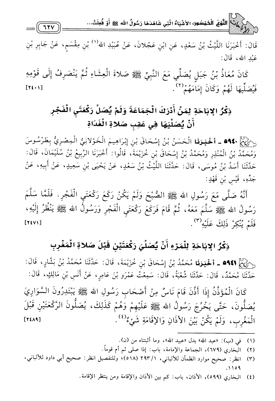 ٥٩٤١ - أَخبَرنا مُحَمَّدُ بْنُ إِسْحَاقَ بْنِ خُزَيْمَةَ، قَالَ: حَدثنا مُحَمَّدُ بْنُ بَشَّارٍ، قَالَ: حَدثنا مُحَمَّدٌ، قَالَ: حَدثنا شُعْبَةُ، قَالَ: سَمِعْتُ عَمْرَو بْنَ عَامِرٍ، عَنْ أَنَسِ بْنِ مَالِكٍ، قَالَ: كَانَ الْمُؤَذِّنُ إِذَا أَذَّنَ قَامَ نَاسٌ مِنْ أَصْحَابِ رَسُولِ اللهِ صَلى الله عَلَيه وسَلم يَبْتَدِرُونَ السَّوَارِيَ يُصَلُّونَ، حَتَّى يَخْرُجَ رَسُولُ اللهِ صَلى الله عَلَيه وسَلم عَلَيْهِمْ وَهُمْ كَذَلِكَ، يُصَلُّونَ الرَّكْعَتَيْنِ قَبْلَ الْمَغْرِبِ، وَلَمْ يَكُنْ بَيْنَ الأَذَانِ وَالإِقَامَةِ شَيْءٌ. [٢٤٨٩]