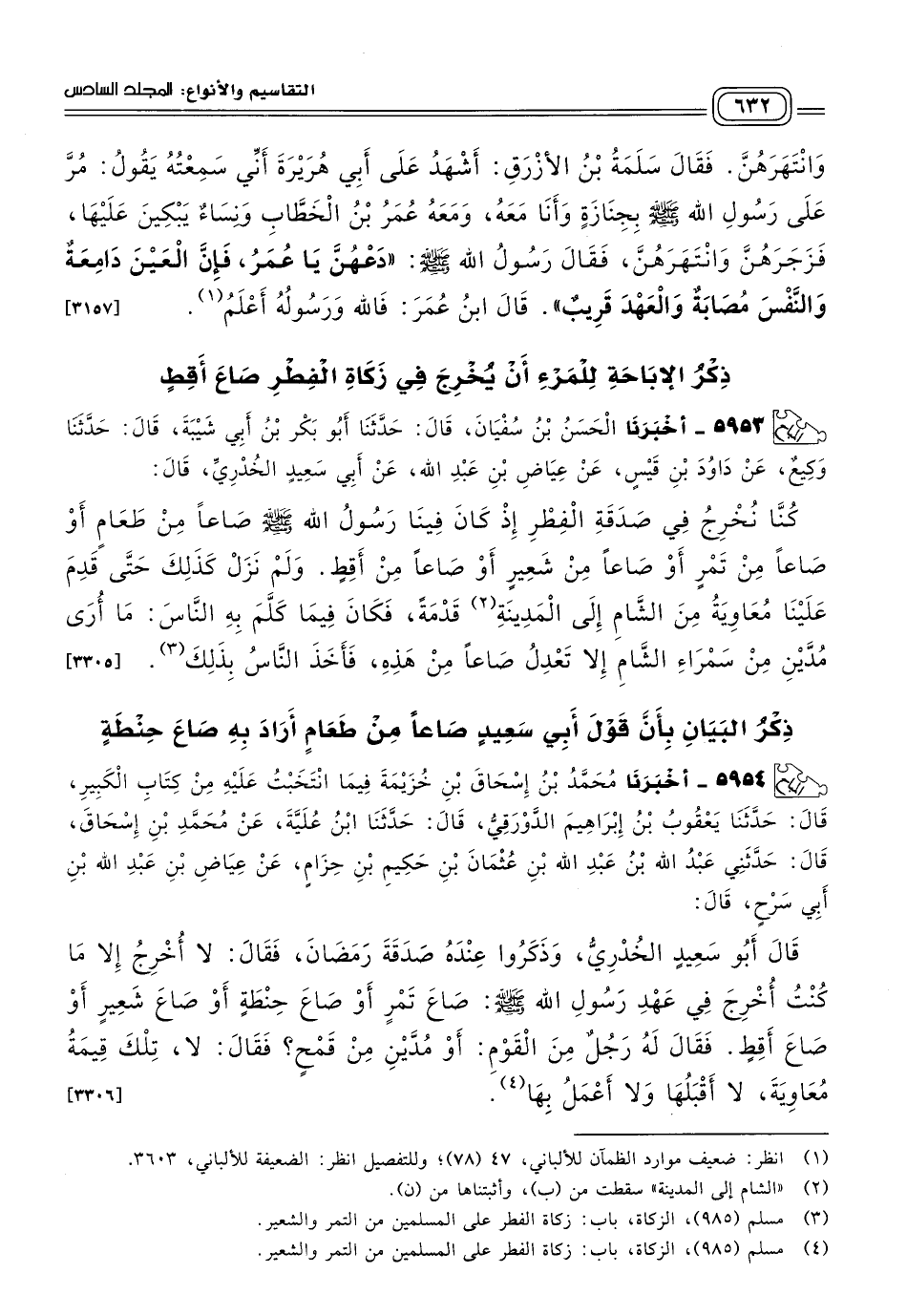 ٥٩٥٤ - أَخبَرنا مُحَمَّدُ بْنُ إِسْحَاقَ بْنِ خُزَيْمَةَ فِيمَا انْتَخَبْتُ عَلَيْهِ مِنْ كِتَابِ الْكَبِيرِ، قَالَ: حَدثنا يَعْقُوبُ بْنُ إِبْرَاهِيمَ الدَّوْرَقِيُّ، قَالَ: حَدثنا ابْنُ عُلَيَّةَ، عَنْ مُحَمَّدِ بْنِ إِسْحَاقَ، قَالَ: حَدَّثَنِي عَبْدُ اللهِ بْنُ عَبْدِ اللهِ بْنِ عُثْمَانَ بْنِ حَكِيمِ بْنِ حِزَامٍ، عَنْ عِيَاضِ بْنِ عَبْدِ اللهِ بْنِ أَبِي سَرْحٍ، قَالَ: قَالَ أَبُو سَعِيدٍ الْخُدْرِيُّ، وَذَكَرُوا عِنْدَهُ صَدَقَةَ رَمَضَانَ، فَقَالَ: لَا أُخْرِجُ إِلَاّ مَا كُنْتُ أُخْرِجُ فِي عَهْدِ رَسُولِ اللهِ صَلى الله عَلَيه وسَلم، صَاعَ تَمْرٍ أَوْ صَاعَ حِنْطَةٍ أَوْ صَاعَ شَعِيرٍ أَوْ صَاعَ أَقِطٍ، فَقَالَ لَهُ رَجُلٌ مِنَ الْقَوْمِ: أَوْ مُدَّيْنِ مِنْ قَمْحٍ؟ فَقَالَ: لَا، تِلْكَ قِيمَةُ مُعَاوِيَةَ، لَا أَقْبَلُهَا وَلَا أَعْمَلُ بِهَا. [٣٣٠٦]