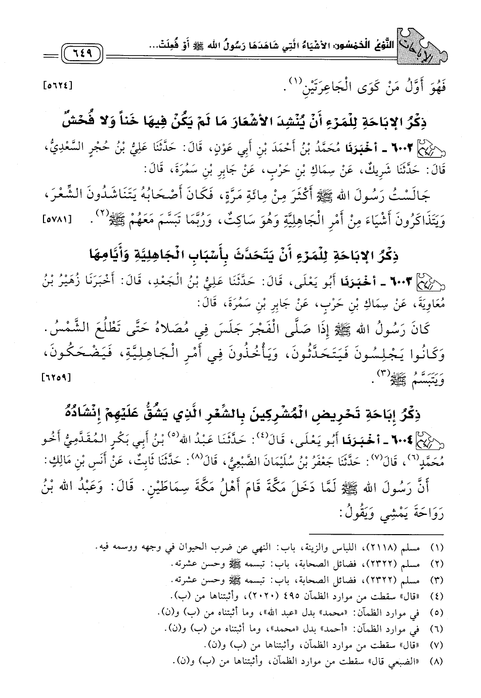 ٦٠٠٣ - أَخبَرنا أَبُو يَعْلَى، قَالَ: حَدثنا عَلِيُّ بْنُ الْجَعْدِ، قَالَ: أَخبَرنا زُهَيْرُ بْنُ مُعَاوِيَةَ، عَنْ سِمَاكِ بْنِ حَرْبٍ، عَنْ جَابِرِ بْنِ سَمُرَةَ، قَالَ: كَانَ رَسُولُ اللهِ صَلى الله عَلَيه وسَلم إِذَا صَلَّى الْفَجْرَ جَلَسَ فِي مُصَلَاّهُ حَتَّى تَطْلُعَ الشَّمْسُ، وَكَانُوا يَجْلِسُونَ فَيَتَحَدَّثُونَ، وَيَأْخُذُونَ فِي أَمْرِ الْجَاهِلِيَّةِ، فَيَضْحَكُونَ، وَيَتَبَسَّمُ صَلى الله عَلَيه وسَلم. [٦٢٥٩]