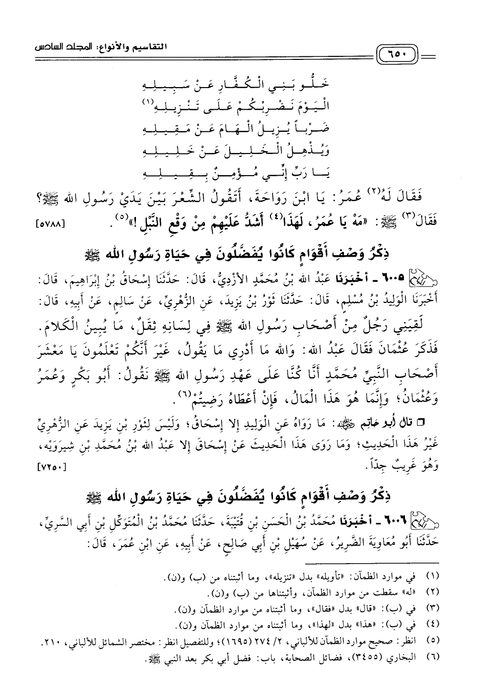 ٦٠٠٥ - أَخبَرنا عَبْدُ اللهِ بْنُ مُحَمَّدٍ الأَزْدِيُّ، قَالَ: حَدثنا إِسْحَاقُ بْنُ إِبْرَاهِيمَ، قَالَ: أَخبَرنا الْوَلِيدُ بْنُ مُسْلِمٍ، قَالَ: حَدثنا ثَوْرُ بْنُ يَزِيدَ، عَنِ الزُّهْرِيِّ، عَنْ سَالِمٍ، عَنْ أَبِيهِ، قَالَ: لَقِيَنِي رَجُلٌ مِنْ أَصْحَابِ رَسُولِ اللهِ صَلى الله عَلَيه وسَلم فِي لِسَانِهِ ثِقَلٌ، مَا يُبِينُ الْكَلَامَ، فَذَكَرَ عُثْمَانَ، فَقَالَ عَبْدُ اللهِ: وَاللهِ مَا أَدْرِي مَا يَقُولُ، غَيْرَ أَنَّكُمْ تَعْلَمُونَ يَا مَعْشَرَ أَصْحَابِ النَّبِيِّ مُحَمَّدٍ أَنَّا كُنَّا عَلَى عَهْدِ رَسُولِ اللهِ صَلى الله عَلَيه وسَلم نَقُولُ: أَبُو بَكْرٍ وَعُمَرُ وَعُثْمَانُ، وَإِنِّمَا هُوَ هَذَا الْمَالُ، فَإِنْ أَعْطَاهُ رَضِيتُمْ.