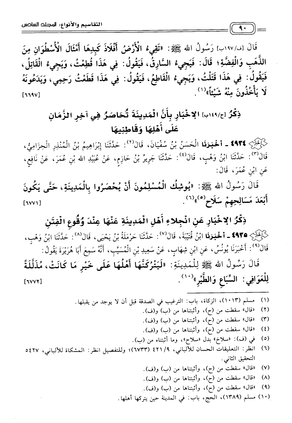 ٤٩٣٤ - أَخبَرنا الْحَسَنُ بْنُ سُفْيَانَ، قَالَ: حَدثنا إِبْرَاهِيمُ بْنُ الْمُنْذِرِ الْحِزَامِيُّ، قَالَ: حَدثنا ابْنُ وَهْبٍ، قَالَ: حَدثنا جَرِيرُ بْنُ حَازِمٍ، عَنْ عُبَيْدِ اللهِ بْنِ عُمَرَ، عَنْ نَافِعٍ، عَنِ ابْنِ عُمَرَ، قَالَ: قَالَ رَسُولُ اللهِ صَلى الله عَلَيه وسَلم: "يُوشِكُ الْمُسْلِمُونَ أَنْ يُحْصَرُوا بِالْمَدِينَةِ حَتَّى يَكُونَ أَبْعَدَ مَسَالِحِهِمْ سَلَاحُ". [٦٧٧١]