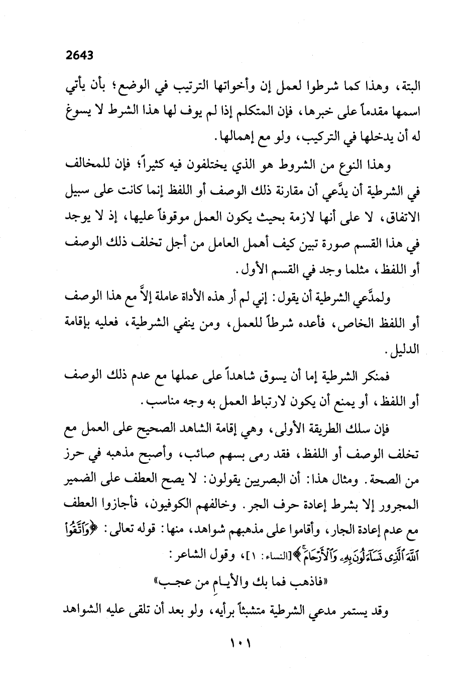 وهذا النوع من الشروط هو الذي يختلفون فيه كثيراً؛ فإن للمخالف في الشرطية أن يدَّعي أن مقارنة ذلك الوصف أو اللفظ إنما كانت على سبيل الاتفاق، لا على أنها لازمة بحيث يكون العمل موقوفاً عليها، إذ لا يوجد في هذا القسم صورة تبين كيف أهمل العامل من أجل تخلف ذلك الوصف أو اللفظ، مثلما وجد في القسم الأول.