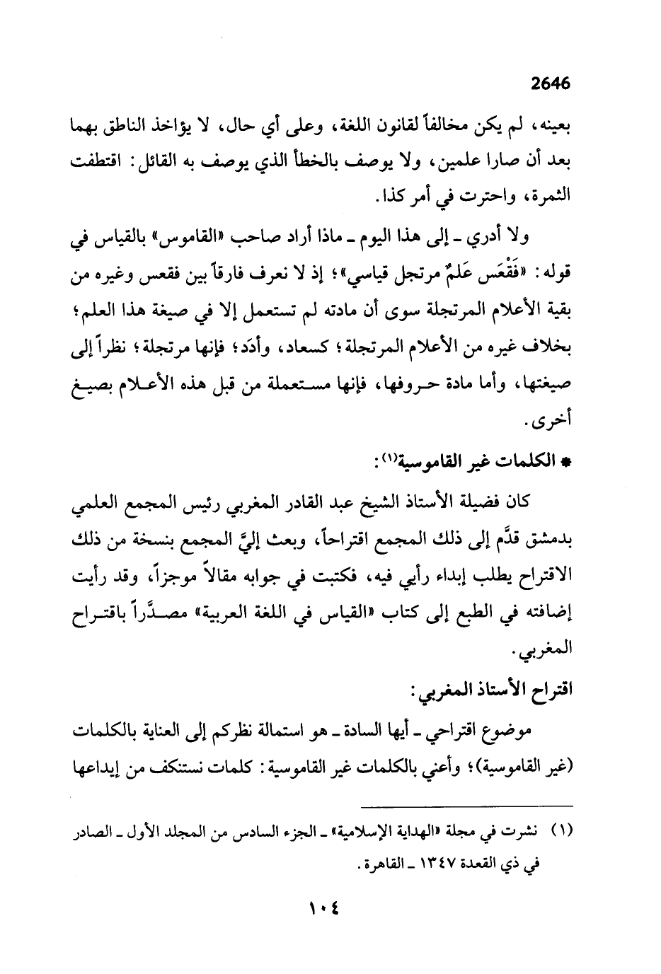 كان فضيلة الأستاذ الشيخ عبد القادر المغربي رئيس المجمع العلمي بدمشق قدَّم إلى ذلك المجمع اقتراحاً، وبعث إليَّ المجمع بنسخة من ذلك الاقتراح يطلب إبداء رأي فيه، فكتبت في جوابه مقالاً موجزاً، وقد رأيت إضافته في الطبع إلى كتاب "القياس في اللغة العربية" مصدَّراً باقتراح المغربي.
