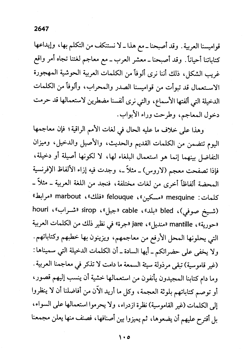وهذا على خلاف ما عليه الحال في لغات الأمم الراقية؛ فإن معاجمها اليوم تتضمن من الكلمات القديم والحديث، والأصيل والدخيل، وميزان التفاضل بينهما إنما هو استعمال البلغاء لها، لا لكونها أصيلة أو دخيلة، فإذا تصفحت معجم (لاروس) - مثل -، وجدت فيه إزاء الألفاظ الإفرنسية المحضة ألفاظاً أخرى من لغات مختلفة، فنجد من اللغة العربية - مثلاً - كلمات: mesquine " مسكين"، felouque " فلك"، marbout " مرابط" (شيخ صوفي)، bled " بلد"، cable " جبل"، sirop " شراب"، houri " حورية"، mantille " منديل"، jare " جرة" في نظير ذلك من الكلمات العربية التي يحلونها المحل الأرفع من معاجمهم، ويزينون بها خطبهم وكتاباتهم. ولا يخفى على حضراتكم - أيها السادة - أن الكلمات الدخيلة التي سميناها: (غير قاموسية) تبقى مرذولة سيئة السمعة ما دامت لا تذكر في معاجمنا العربية. وما دام كتابنا المجيدون يأنفون من استعمالها خشية أن ينسب إليهم قصور، أو توصم كتاباتهم بلوثة العجمة، وكل ما أريد الآن من أفاضلنا أن لا ينظروا إلى الكلمات (غير القاموسية) نظرة ازدراء، ولا يحرموا استعمالها على السواء، بل أقترح عليهم أن يضعوها، ثم يميزوا بين أصنافها، فصنف منها يعلن مجمعنا