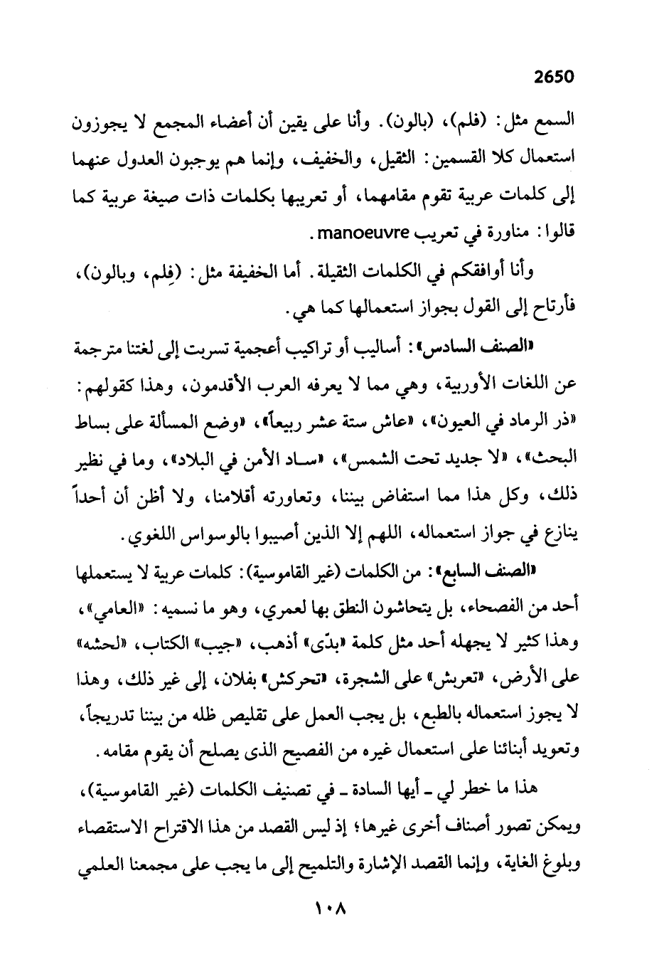 "الصنف السادس": أساليب أو تراكيب أعجمية تسربت إلى لغتنا مترجمة عن اللغات الأوربية، وهي مما لا يعرفه العرب الأقدمون، وهذا كقولهم: "ذر الرماد في العيون"، "عاش ستة عشر ربيعاً"، "وضع المسألة على بساط البحث"، "لا جديد تحت الشمس"، "ساد الأمن في البلاد"، وما في نظير ذلك، وكل هذا مما استفاض بيننا، وتعاورته أقلامنا، ولا أظن أن أحداً ينازع في جواز استعماله، اللهم إلا الذين أصيبوا بالوسواس اللغوي.