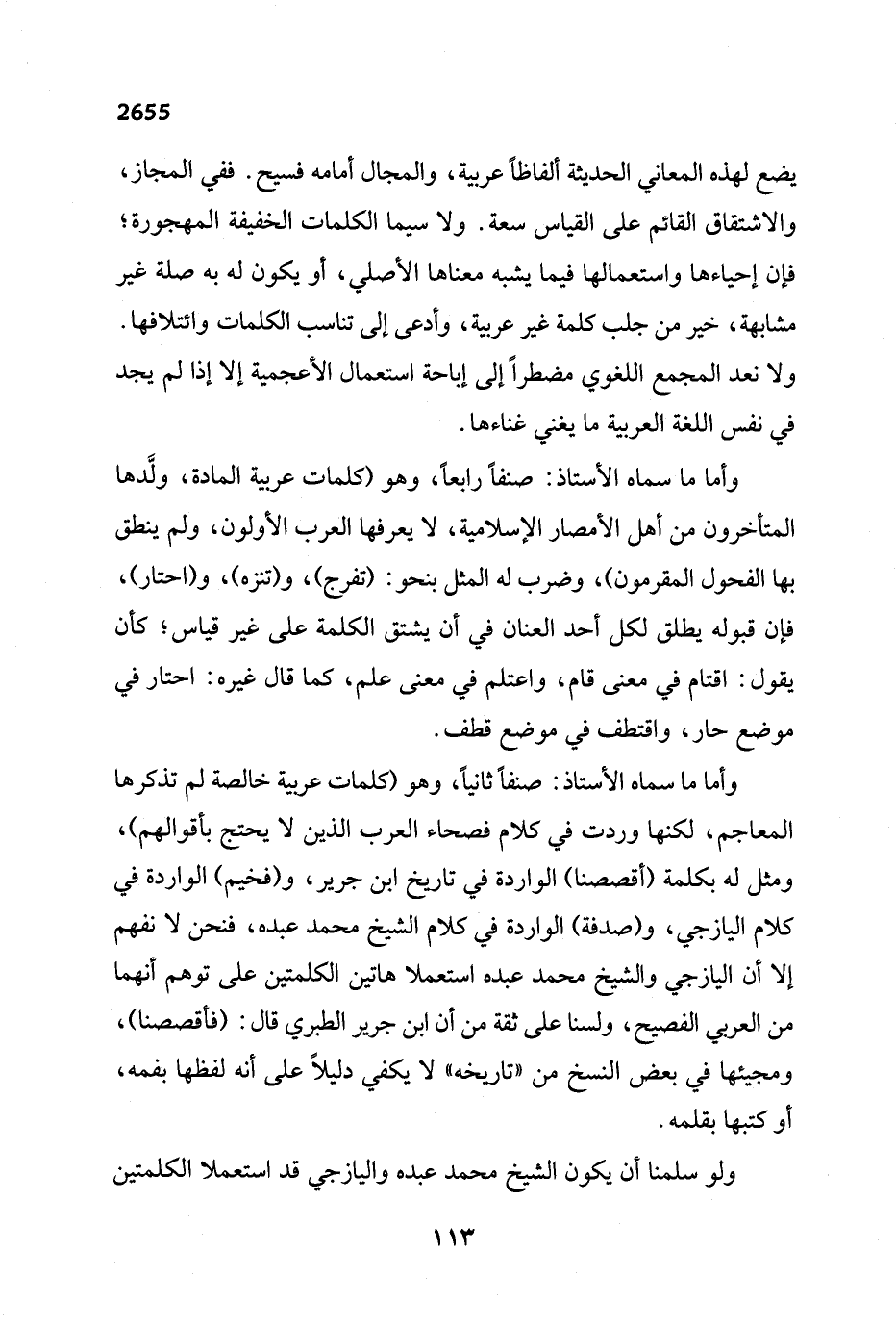 وأما ما سماه الأستاذ: صنفاً ثانياً، وهو (كلمات عربية خالصة لم تذكرها المعاجم، لكنها وردت في كلام فصحاء العرب الذين لا يحتج بأقوالهم)، ومثل له بكلمة (أقصصنا) الواردة في تاريخ ابن جرير، و (فخيم) الواردة في كلام اليازجي، و (صدفة) الواردة في كلام الشيخ محمد عبده، فنحن لا نفهم إلا أن اليازجي والشيخ محمد عبده استعملا هاتين الكلمتين على توهم أنهما من العربي الفصيح، ولسنا على ثقة من أن ابن جرير الطبري قال: (فاقصصنا)، ومجيئها في بعض النسخ من "تاريخه" لا يكفي دليلاً على أنه لفظها بفمه، أو كتبها بقلمه.