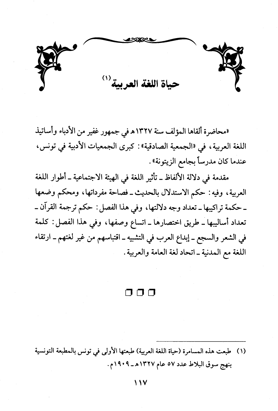 (¬1) طبعت هذه المسامرة (حياة اللغة العربية) طبعتها الأولى في تونس بالمطبعة التونسية بنهج سوق البلاط عدد 57 عام 1327 هـ - 1909 م.