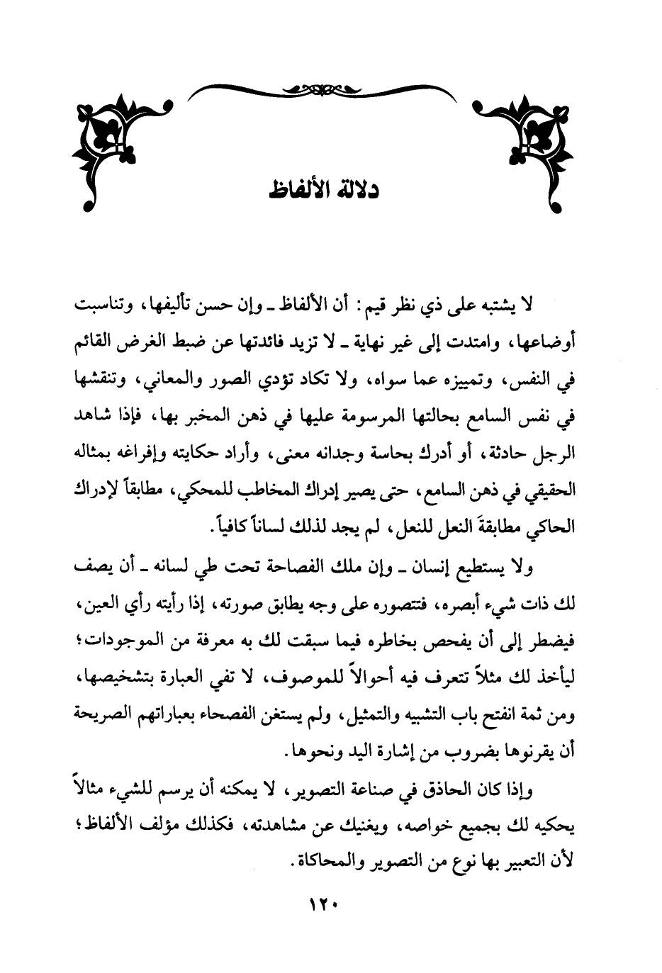 لا يشتبه على ذي نظر قيم: أن الألفاظ - وإن حسن تاليفها، وتناسبت أوضاعها، وامتدت إلى غير نهاية - لا تزيد فائدتها عن ضبط الغرض القائم في النفس، وتمييزه عما سواه، ولا تكاد تؤدي الصور والمعاني، وتنقشها في نفس السامع بحالتها المرسومة عليها في ذهن المخبر بها، فإذا شاهد الرجل حادثة، أو أدرك بحاسة وجدانه معنى، وأراد حكايته وإفراغه بمثاله الحقيقي في ذهن السامع، حتى يصير إدراك المخاطب للمحكي، مطابقاً لإدراك الحاكي مطابقةَ النعل للنعل، لم يجد لذلك لساناً كافياً.