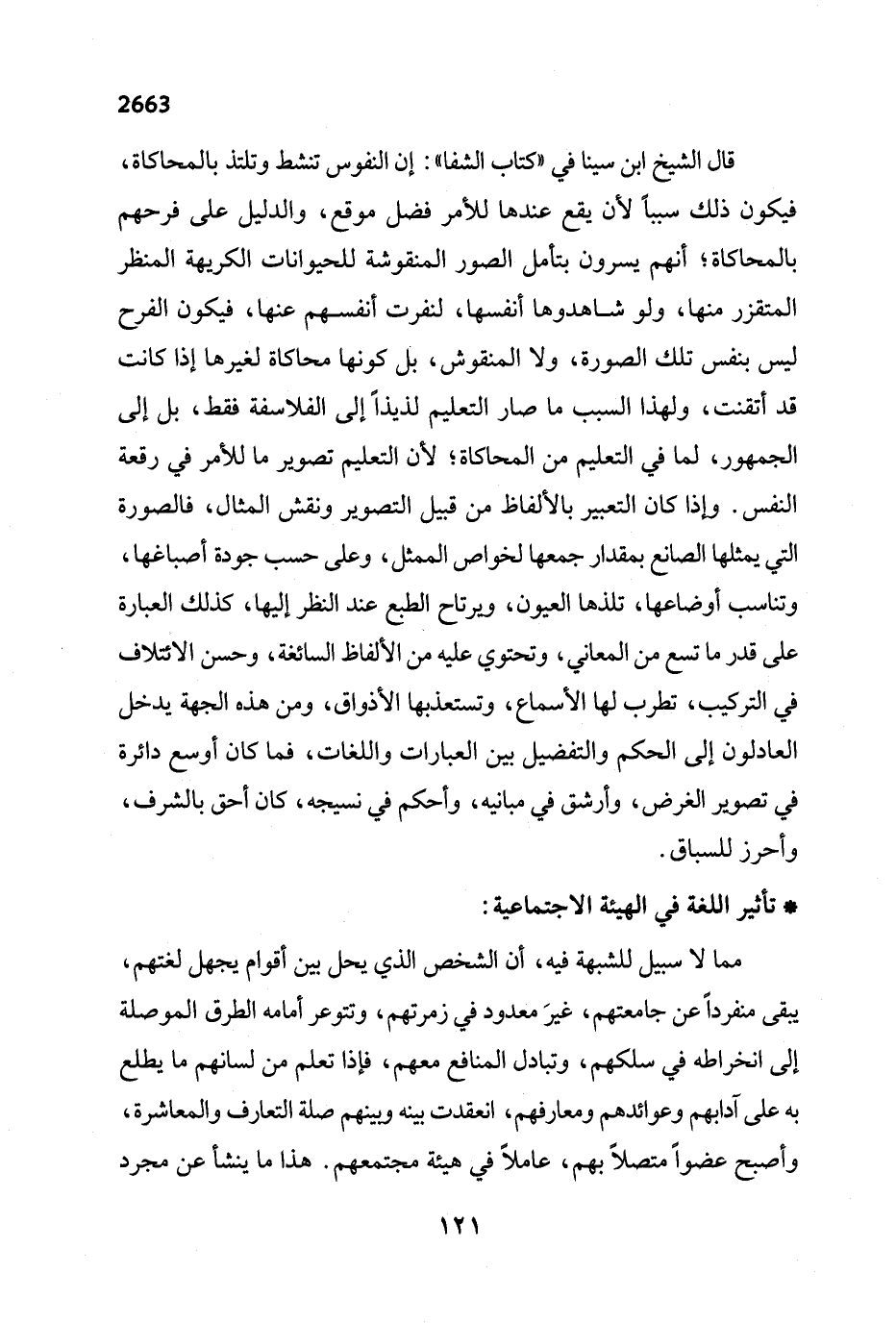 قال الشيخ ابن سينا في "كتاب الشفا": إن النفوس تنشط وتلتذ بالمحاكاة، فيكون ذلك سبباً لأن يقع عندها للأمر فضل موقع، والدليل على فرحهم بالمحاكاة؛ أنهم يسرون بتامل الصور المنقوشة للحيوانات الكريهة المنظر المتقزر منها، ولو شاهدوها أنفسها، لنفرت أنفسهم عنها، فيكون الفرح ليس بنفس تلك الصورة، ولا المنقوش، بل كونها محاكاة لغيرها إذا كانت قد أتقنت، ولهذا السبب ما صار التعليم لذيذاً إلى الفلاسفة فقط، بل إلى الجمهور، لما في التعليم من المحاكاة؛ لأن التعليم تصوير ما للأمر في رقعة النفس. وإذا كان التعبير بالألفاظ من قبيل التصوير ونقش المثال، فالصورة التي يمثلها الصانع بمقدار جمعها لخواص الممثل، وعلى حسب جودة أصباغها، وتناسب أوضاعها، تلذها العيون، ويرتاح الطبع عند النظر إليها، كذلك العبارة على قدر ما تسع من المعاني، وتحتوي عليه من الألفاظ السائغة، وحسن الائتلاف في التركيب، تطرب لها الأسماع، وتستعذبها الأذواق، ومن هذه الجهة يدخل العادلون إلى الحكم والتفضيل بين العبارات واللغات، فما كان أوسع دائرة في تصوير الغرض، وأرشق في مبانيه، وأحكم في نسيجه، كان أحق بالشرف، وأحرز للسباق.