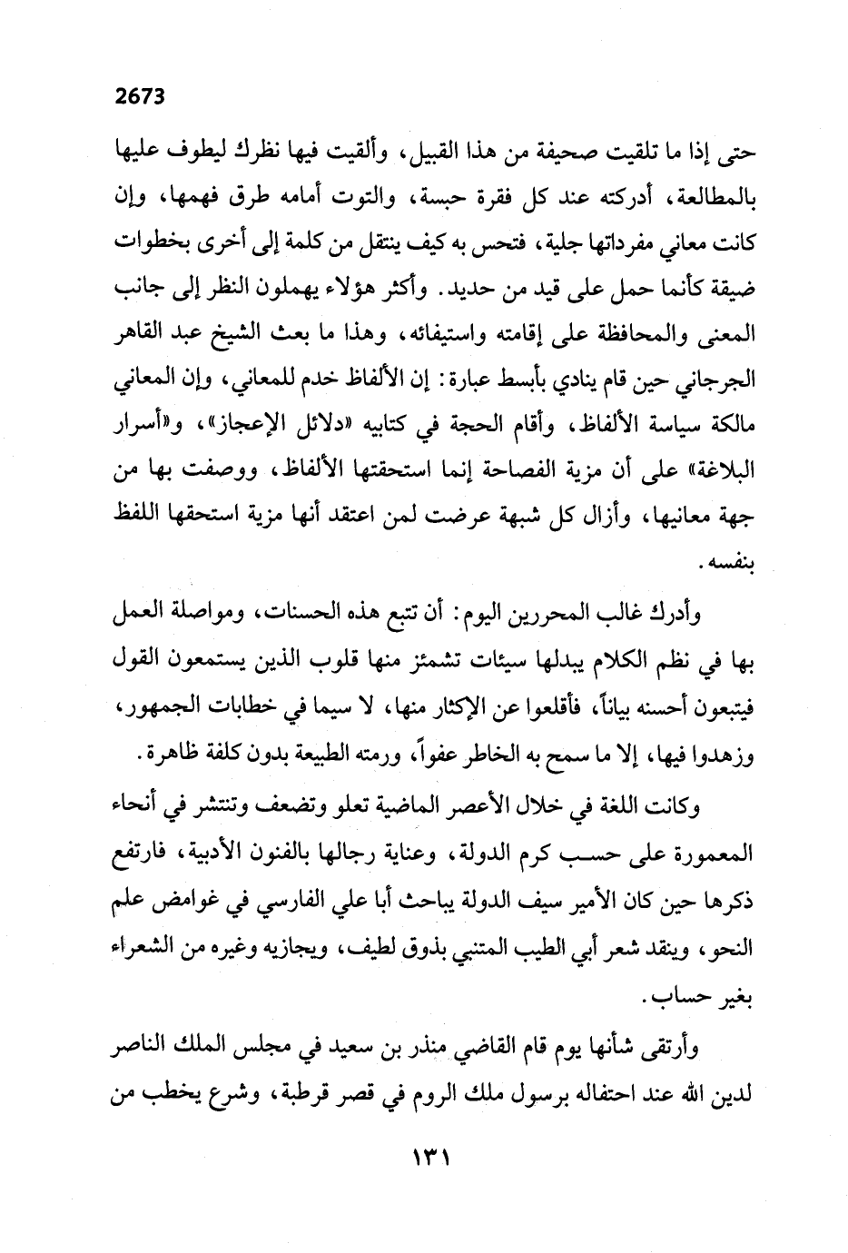 حتى إذا ما تلقيت صحيفة من هذا القبيل، وألقيت فيها نظرك ليطوف عليها بالمطالعة، أدركته عند كل فقرة حبسة، والتوت أمامه طرق فهمها، وإن كانت معاني مفرداتها جلية، فتحس به كيف ينتقل من كلمة إلى أخرى بخطوات ضيقة كأنما حمل على قيد من حديد. وأكثر هؤلاء يهملون النظر إلى جانب المعنى والمحافظة على إقامته واستيفائه، وهذا ما بعث الشيخ عبد القاهر الجرجاني حين قام ينادي بابسط عبارة: إن الألفاظ خدم للمعاني، وإن المعاني مالكة سياسة الألفاظ، وأقام الحجة في كتابيه "دلائل الإعجاز"، و"أسرار البلاغة" على أن مزية الفصاحة إنما استحقتها الألفاظ، ووصفت بها من جهة معانيها، وأزال كل شبهة عرضت لمن اعتقد أنها مزية استحقها اللفظ بنفسه.