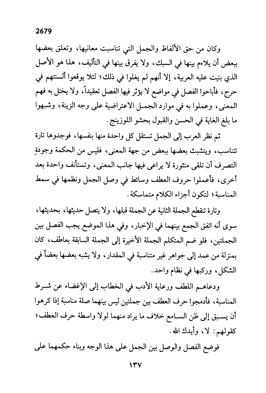 وكان من حق الألفاظ والجمل التي تناسبت معانيها، وتعلق بعضها ببعض أن يلاءم بينها في السبك، ولا يفرق بينها في التأليف، هذا هو الأصل الذي بنيت عليه العربية، إلا أنهم لم يغلوا في ذلك؛ لئلا يوقعوا ألسنتهم في حرج، فأباحوا الفصل في مواضع لا يؤثر فيها الفصل تعقيداً، ولا يختل به فهم المعنى، وعملوا به في موارد الجمل الاعتراضية على وجه الزينة، وشبهوا ما بلغ الغاية في الحسن والقبول بحشو اللوزينج.