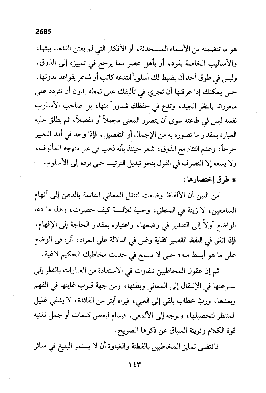 هو ما تتضمنه من الأسماء المستحدثة، أو الأفكار التي لم يعتن القدماء ببثها، والأساليب الخاصة بفرد، أو بأهل عصر مما يرجع في تمييزه إلى الذوق، وليس في طوق أحد أن يضبط لك أسلوباً ابتدعه كاتب أو شاعر بقواعد يدونها، حتى يمكنك إذا عرفتها أن تجري في تاليفك على نمطه بدون أن تتردد على محرراته بالنظر الجيد، وتدع في حفظك شذوراً منها، بل صاحب الأسلوب نفسه ليس في طاعته سوى أن يتصور المعنى مجملاً أو مفصلاً، ثم يطلق عليه العبارة بمقدار ما تصوره به من الإجمال أو التفصيل، فإذا وجد في أمد التعبير حرجاً، وعدم التئام مع الذوق، شعر حينئذ بأنه ذهب في غير منهجه المألوف، ولا يسعه إلا التصرف في القول بنحو تبديل الترتيب حتى يرده إلى الأسلوب.