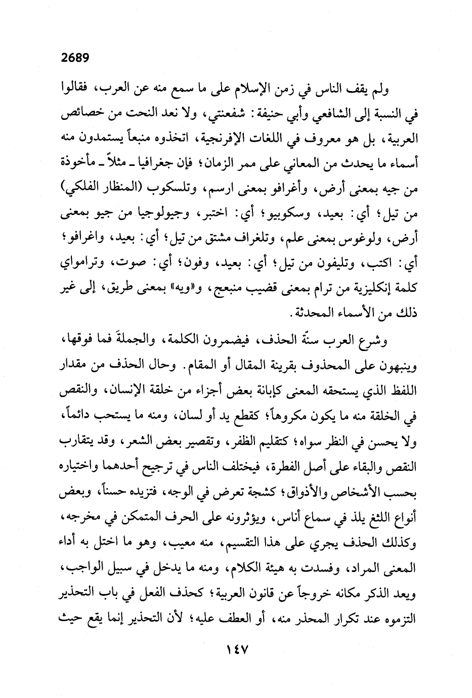 ولم يقف الناس في زمن الإسلام على ما سمع منه عن العرب، فقالوا في النسبة إلى الشافعي وأبي حنيفة: شفعنتي، ولا نعد النحت من خصائص العربية، بل هو معروف في اللغات الإفرنجية، اتخذوه منبعاً يستمدون منه أسماء ما يحدث من المعاني على ممر الزمان؛ فإن جغرافيا - مثلاً - مأخوذة من جيه بمعنى أرض، وأغرافو بمعنى ارسم، وتلسكوب (المنظار الفلكي) من تيل؛ أي: بعيد، وسكوبيو؛ أي: اختبر، وجيولوجيا من جيو بمعنى أرض، ولوغوس بمعنى علم، وتلغراف مشتق من تيل؛ أي: بعيد، واغرافو؛ أي: اكتب، وتليفون من تيل؛ أي: بعيد، وفون؛ أي: صوت، وترامواي كلمة إنكليزية من ترام بمعنى قضيب منبعج، "ويه" بمعنى طريق، إلى غير ذلك من الأسماء المحدثة.