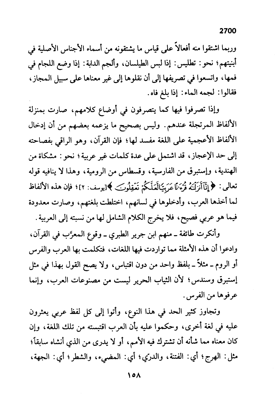 وإذا تصرفوا فيها كما يتصرفون في أوضاع كلامهم، صارت بمنزلة الألفاظ المرتجلة عندهم. وليس بصحيح ما يزعمه بعضهم من أن إدخال الألفاظ الأعجمية على اللغة مفسد لها؛ فإن القرآن، وهو الراقي بفصاحته إلى حد الإعجاز، قد اشتمل على عدة كلمات غير عربية؛ نحو: مشكاة من الهندية، وإستبرق من الفارسية، وقسطاس من الرومية، وهذا لا ينافيه قوله تعالى: {إِنَّا أَنْزَلْنَاهُ قُرْآنًا عَرَبِيًّا لَعَلَّكُمْ تَعْقِلُونَ} [يوسف: 2]؛ فإن هذه الألفاظ لما أخذها العرب، وأدخلوها في لسانهم، اختلطت بلغتهم، وصارت معدودة فيما هو عربي فصيح، فلا يخرج الكلام الشامل لها من نسبته إلى العربية.