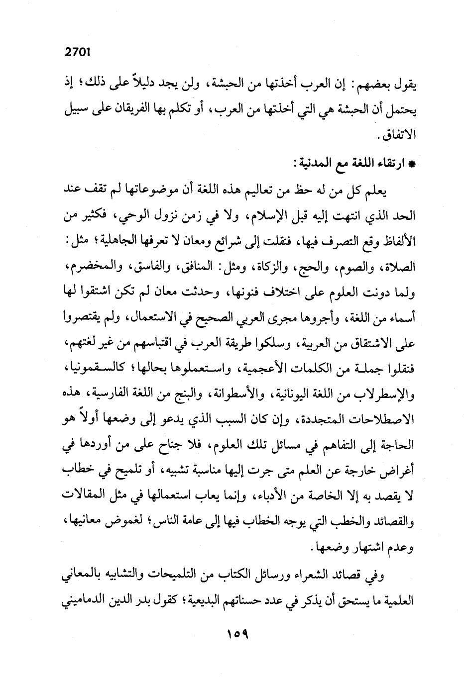 يعلم كل من له حظ من تعاليم هذه اللغة أن موضوعاتها لم تقف عند الحد الذي انتهت إليه قبل الإسلام، ولا في زمن نزول الوحي، فكثير من الألفاظ وقع التصرف فيها، فنقلت إلى شرائع ومعان لا تعرفها الجاهلية؛ مثل: الصلاة، والصوم، والحج، والزكاة، ومثل: المنافق، والفاسق، والمخضرم، ولما دونت العلوم على اختلاف فنونها، وحدثت معان لم تكن اشتقوا لها أسماء من اللغة، وأجروها مجرى العربي الصحيح في الاستعمال، ولم يقتصروا على الاشتقاق من العربية، وسلكوا طريقة العرب في اقتباسهم من غير لغتهم، فنقلوا جملة من الكلمات الأعجمية، واستعملوها بحالها؛ كالسقمونيا، والإسطرلاب من اللغة اليونانية، والأسطوانة، والبنج من اللغة الفارسية، هذه الاصطلاحات المتجددة، وإن كان السبب الذي يدعو إلى وضعها أولاً هو الحاجة إلى التفاهم في مسائل تلك العلوم، فلا جناح على من أوردها في أغراض خارجة عن العلم متى جرت إليها مناسبة تشبيه، أو تلميح في خطاب لا يقصد به إلا الخاصة من الأدباء، وإنما يعاب استعمالها في مثل المقالات والقصائد والخطب التي يوجه الخطاب فيها إلى عامة الناس؛ لغموض معانيها، وعدم اشتهار وضعها.