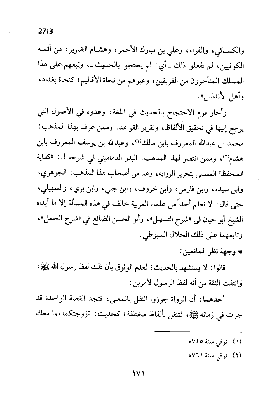 وأجاز قوم الاحتجاج بالحديث في اللغة، وعدوه في الأصول التي يرجع إليها في تحقيق الألفاظ، وتقرير القواعد. وممن عرف بهذا المذهب: محمد بن عبدالله المعروف بابن مالك (¬1)، وعبدالله بن يوسف المعروف بابن هشام (¬2)، وممن انتصر لهذا المذهب: البدر الدماميني في شرحه لى: "كفاية المتحفظ" المسمى بتحرير الرواية، وعد من أصحاب هذا المذهب: الجوهري، وابن سيده، وابن فارس، وابن خروف، وابن جني، وابن بري، والسهيلي، حتى قال: لا نعلم أحداً من علماء العربية خالف في هذه المسألة إلا ما أبداه الشيخ أبو حيان في "شرح التسهيل"، وأبو الحسن الضائع في "شرح الجمل"، وتابعهما على ذلك الجلال السيوطي.